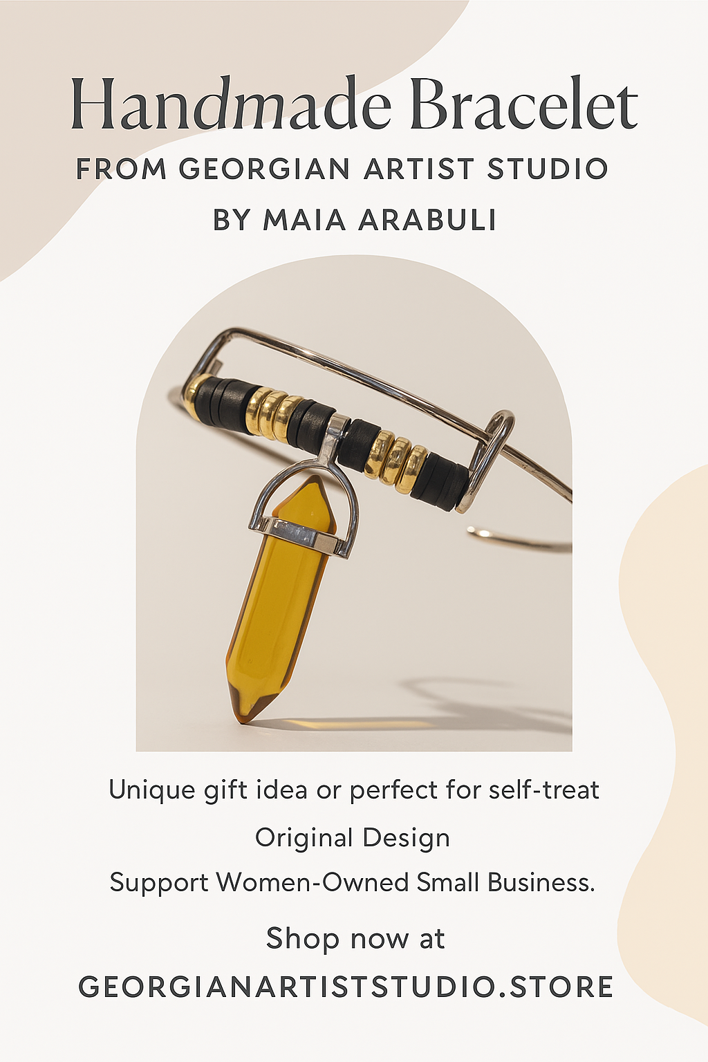 Elevate your style with this one-of-a-kind handmade bracelet from Georgian Artist Studio by Maia Arabuli. Featuring a striking amber-toned crystal pendant suspended on a sleek silver-toned bangle, this bracelet is accented with elegant black and gold-toned spacers for a modern yet earthy design.