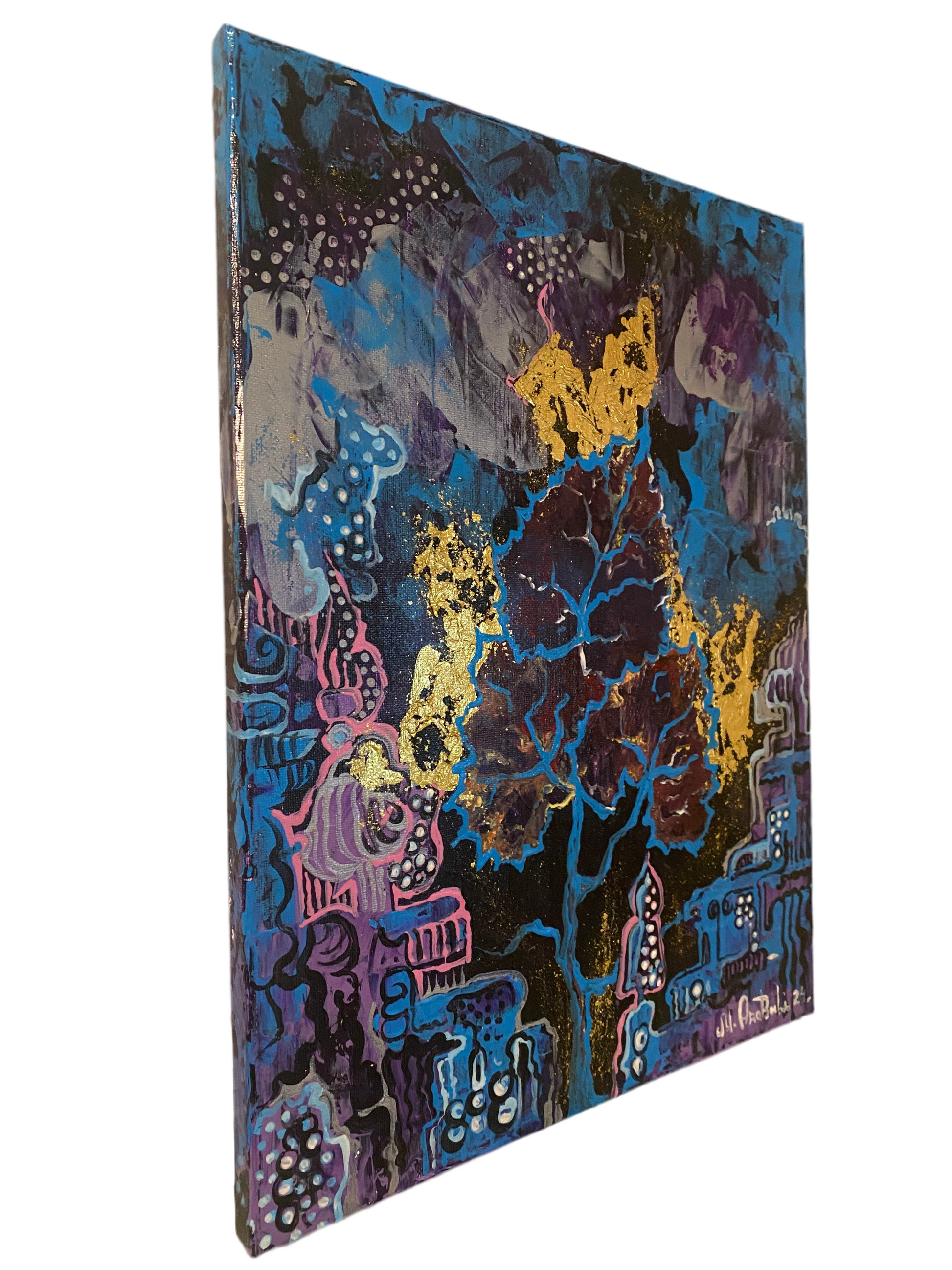 Immerse yourself in the rich symbolism of “Autumn Fell,” a striking abstract painting by Maia Arabuli. This original 16x20 inch canvas features vibrant layers of acrylic paint, intricate textures, and shimmering gold leaf accents that evoke the beauty and mystery of fall. At its heart stands a majestic tree outlined in luminous blue, its golden leaves drifting like memories through a dreamlike cityscape rendered in deep purples, electric blues, and magentas.