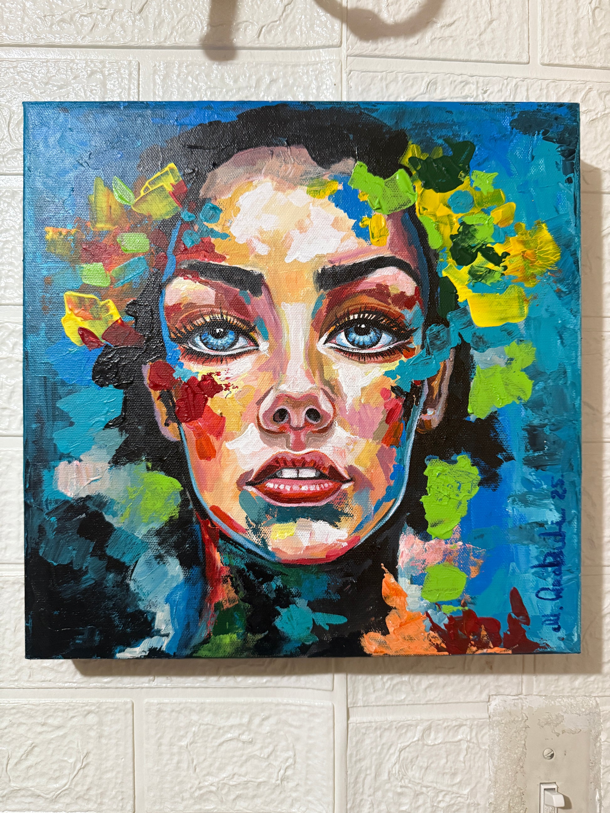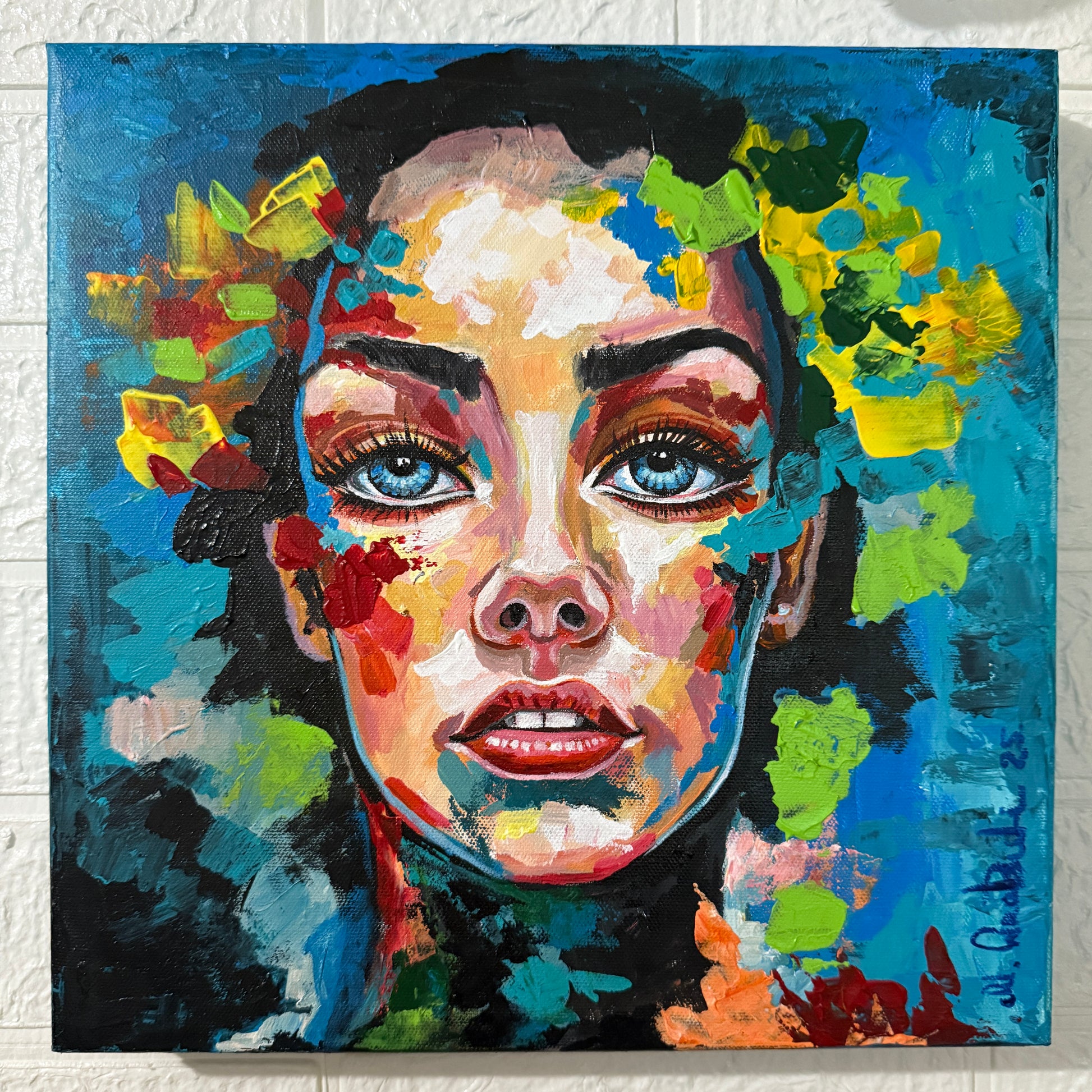 Step into a world where emotion meets nature in vivid harmony. Eyes of the Elements captures the raw, magnetic gaze of a woman whose spirit is woven from fire, earth, water, and air. Layers of vibrant acrylic strokes—emerald greens, fiery reds, golden yellows, and deep ocean blues—merge into a mesmerizing portrait that radiates strength, beauty, and mystery.