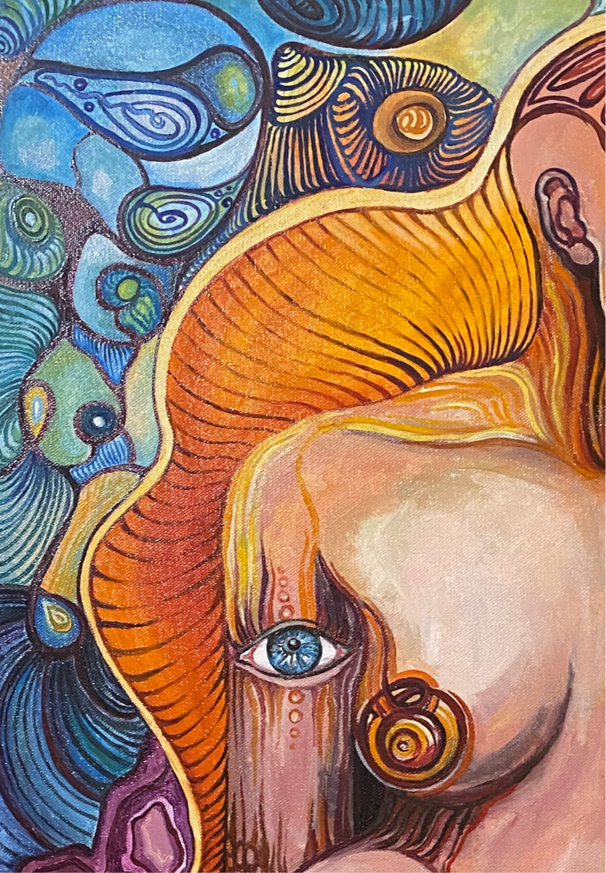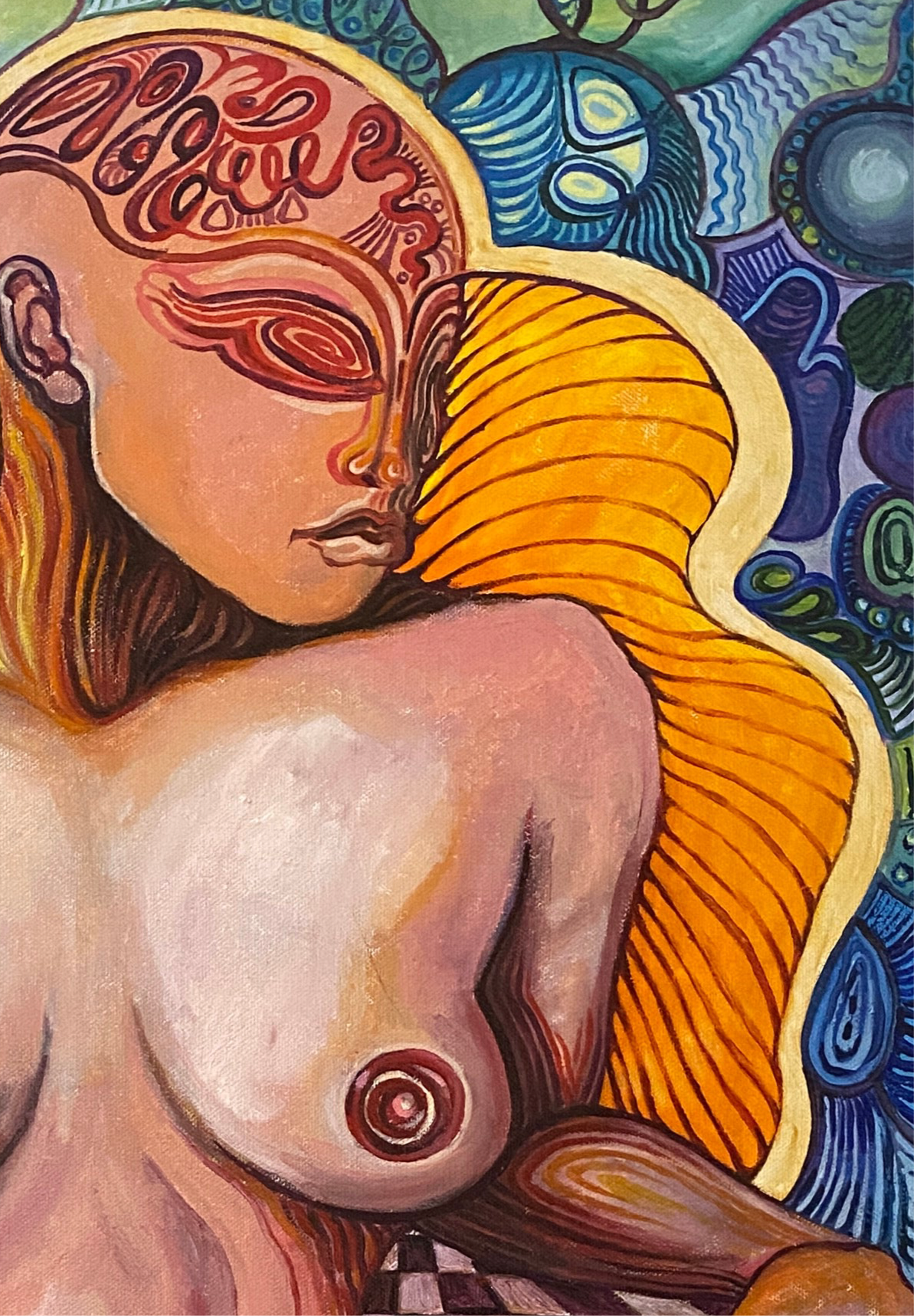 “Future Regeneration” is a visionary oil painting that dives into the complex evolution of identity, consciousness, and rebirth. The central figure — a nude, androgynous humanoid with glowing red skin — sits in a surreal dreamscape, somewhere between time and space. Their partially transparent body is infused with symbolic eyes, golden fingers, and a brain exposed like an organic circuit — all reflecting a fusion of organic life and futuristic design.