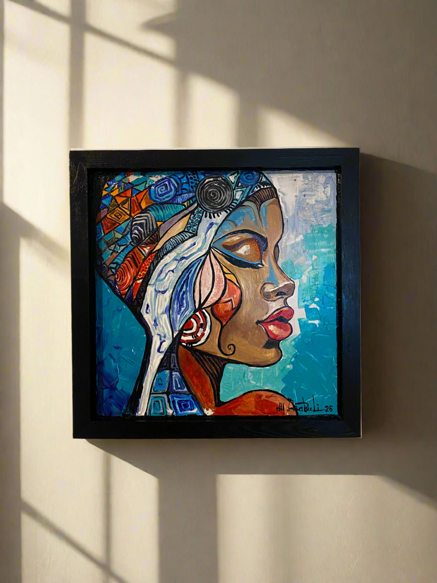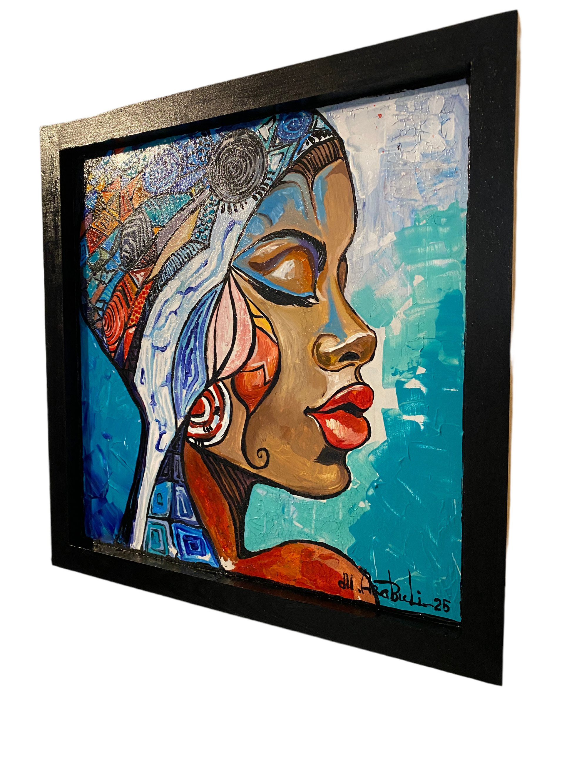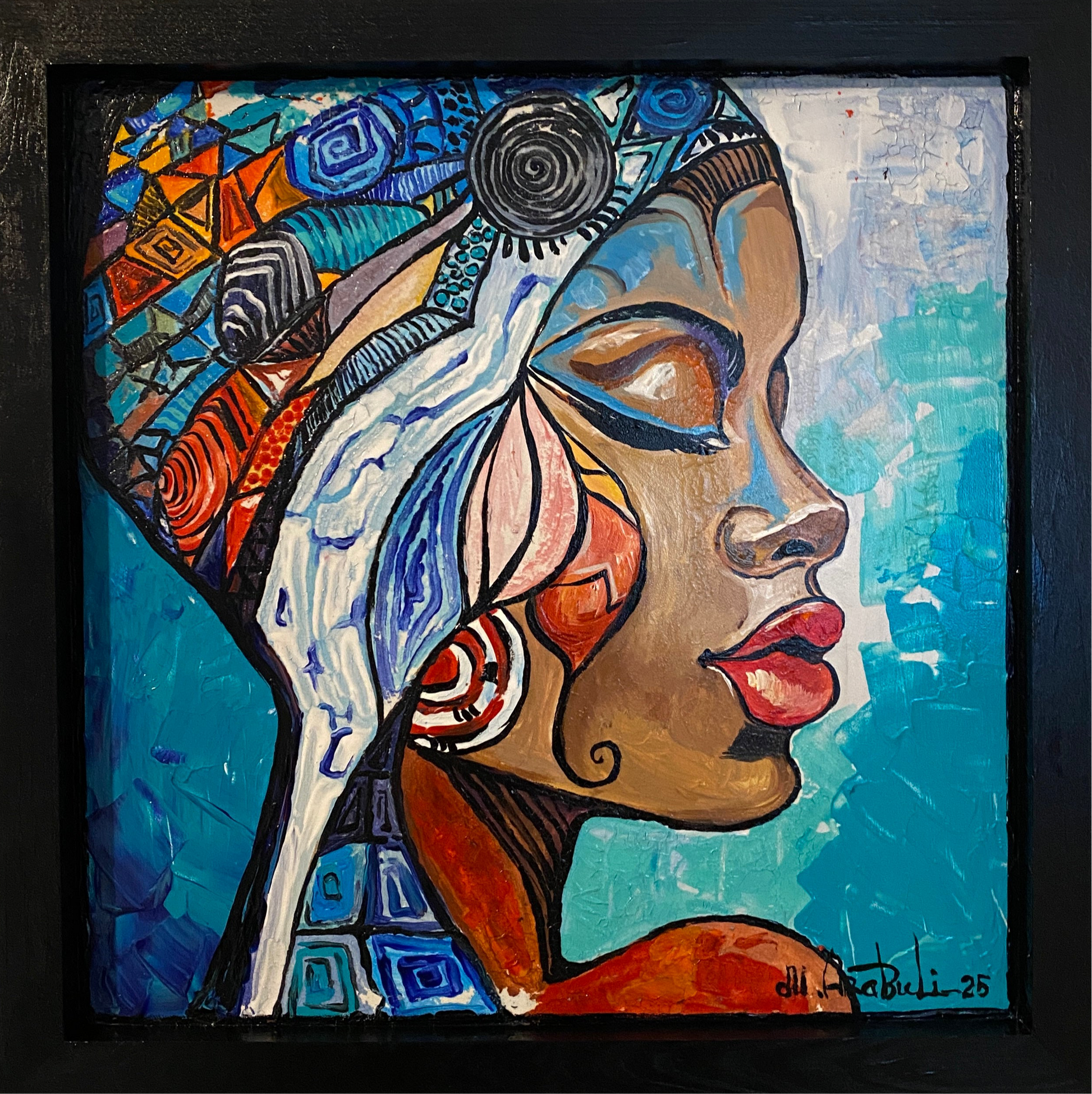 Celebrate bold femininity and vibrant cultural expression with “Last Message”-an original acrylic painting by Georgian artist Maia Arabuli. This striking profile portrait features a confident woman adorned in a richly patterned headwrap, her eyes closed in serene strength. The expressive brushwork, vivid jewel tones, and abstract elements evoke a sense of power, pride, and identity.