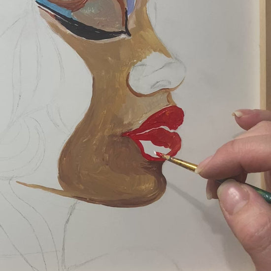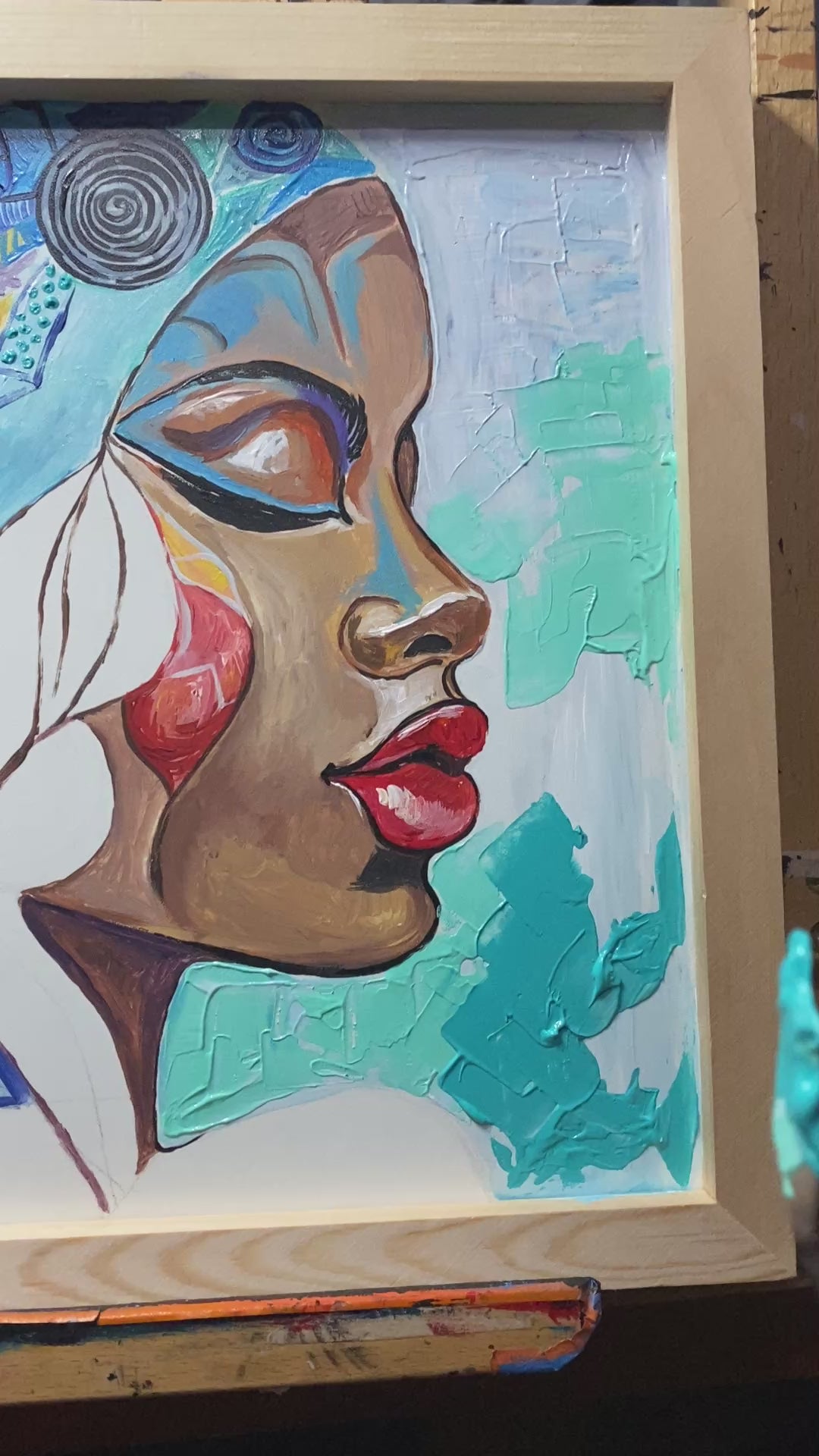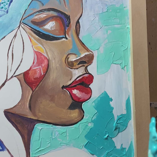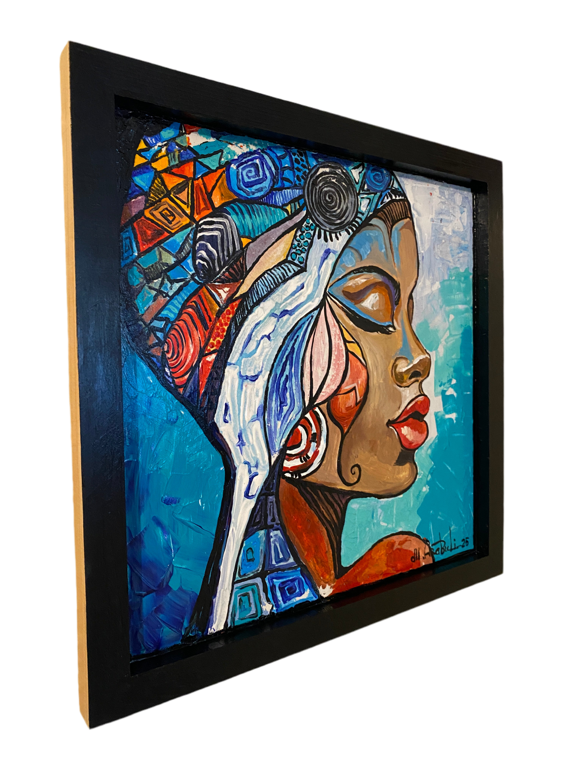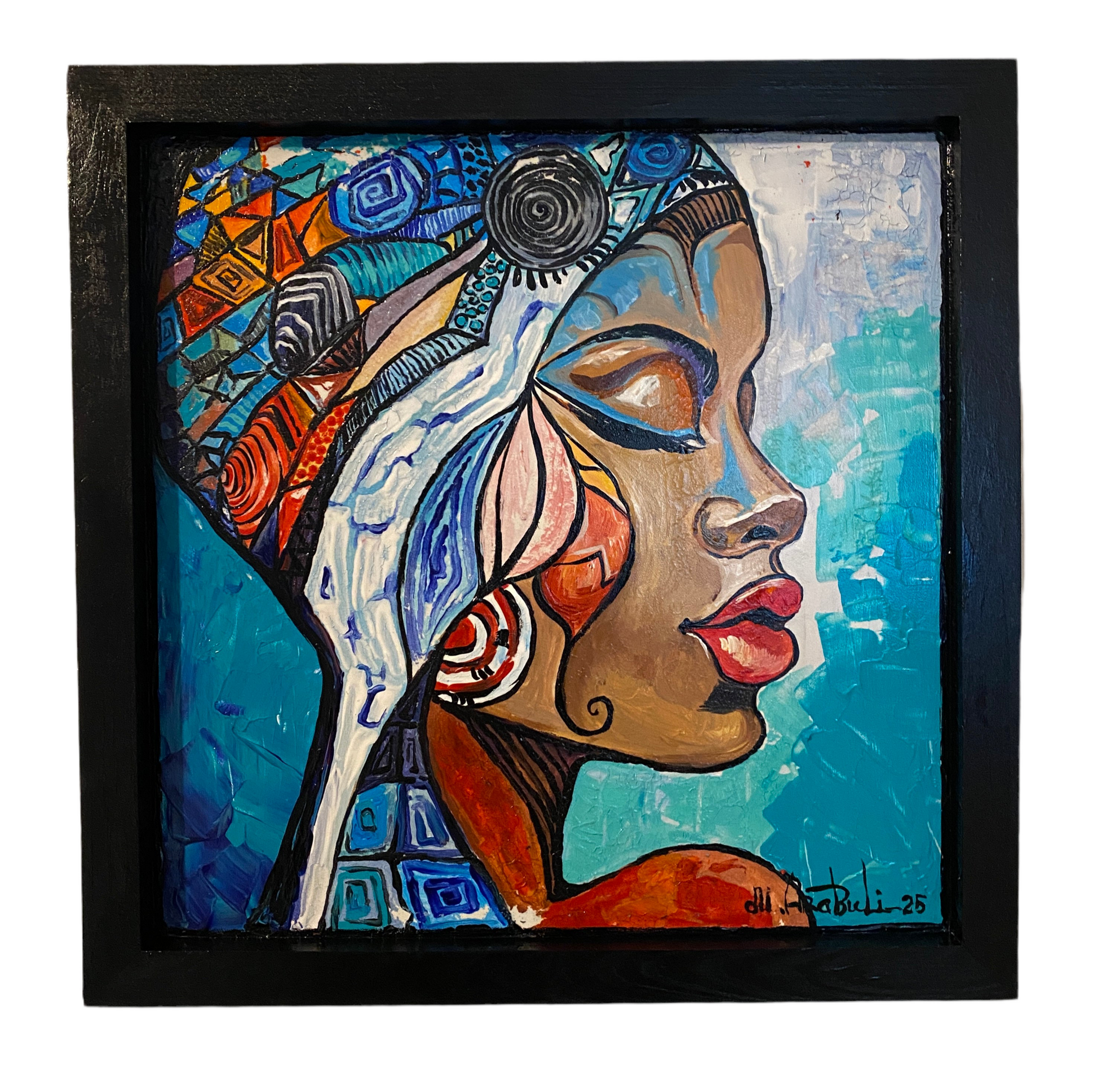 Celebrate bold femininity and vibrant cultural expression with “Last Message”-an original acrylic painting by Georgian artist Maia Arabuli. This striking profile portrait features a confident woman adorned in a richly patterned headwrap, her eyes closed in serene strength. The expressive brushwork, vivid jewel tones, and abstract elements evoke a sense of power, pride, and identity.