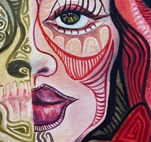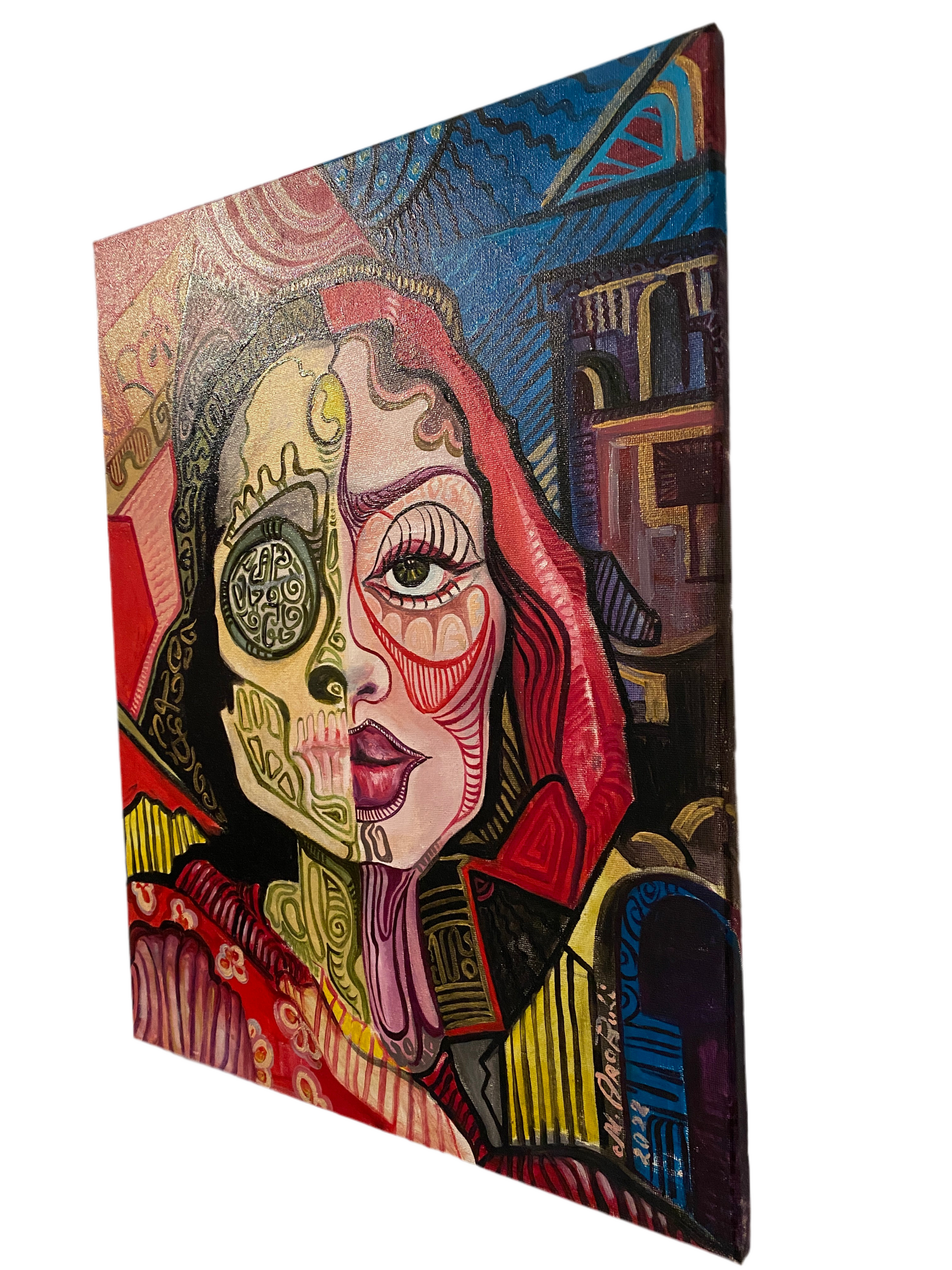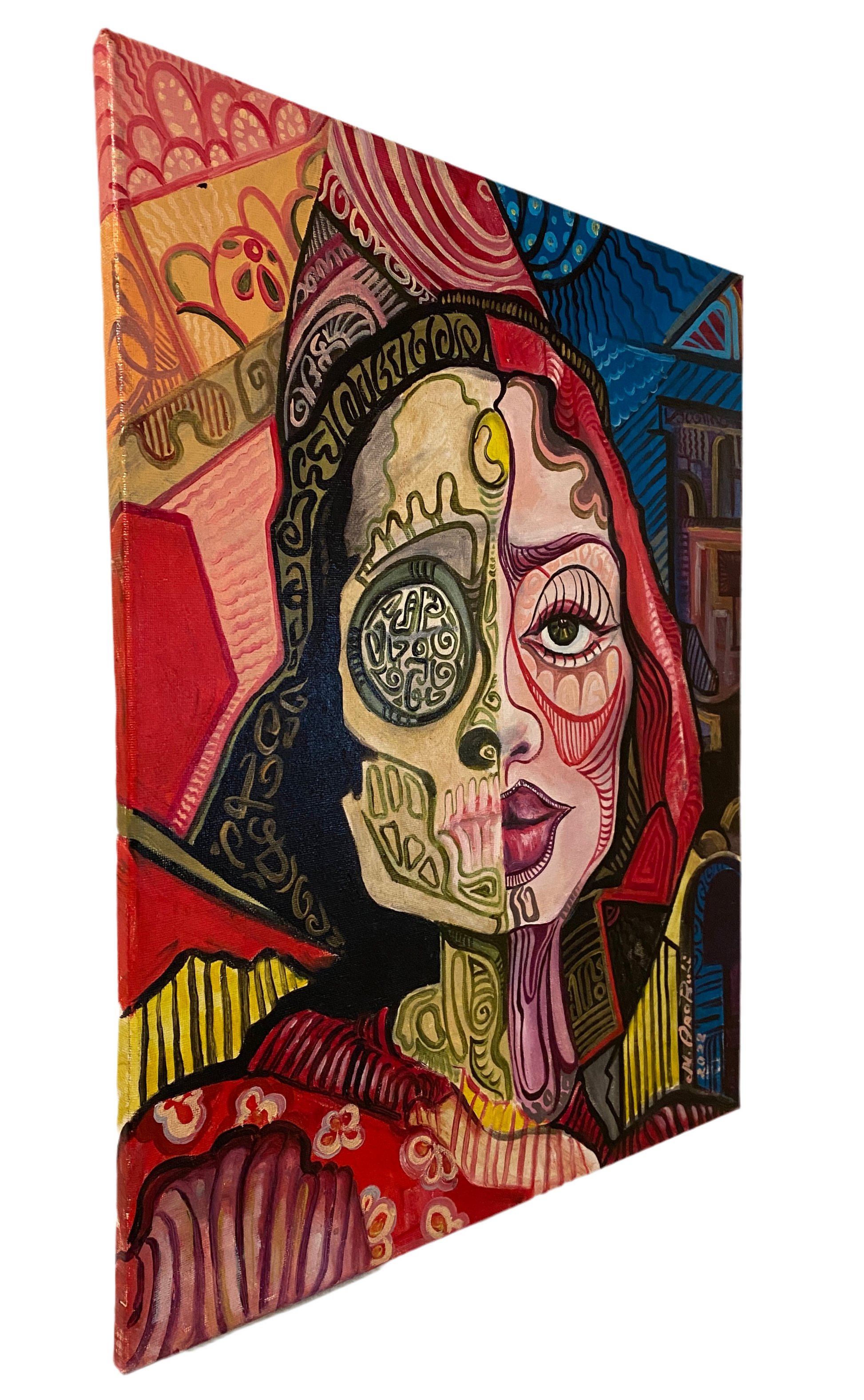 “Life and Death Beauty” is a bold and captivating oil painting that explores the duality of existence through the powerful contrast of vibrant life and haunting mortality. Half of the face depicts an elegant woman in radiant red, adorned with intricate patterns and expressive eyes — a symbol of life, strength, and femininity. The other half unveils a stylized skeletal form, rich in cultural symbols and ornate detail, representing the presence of death and the inevitable passage of time.