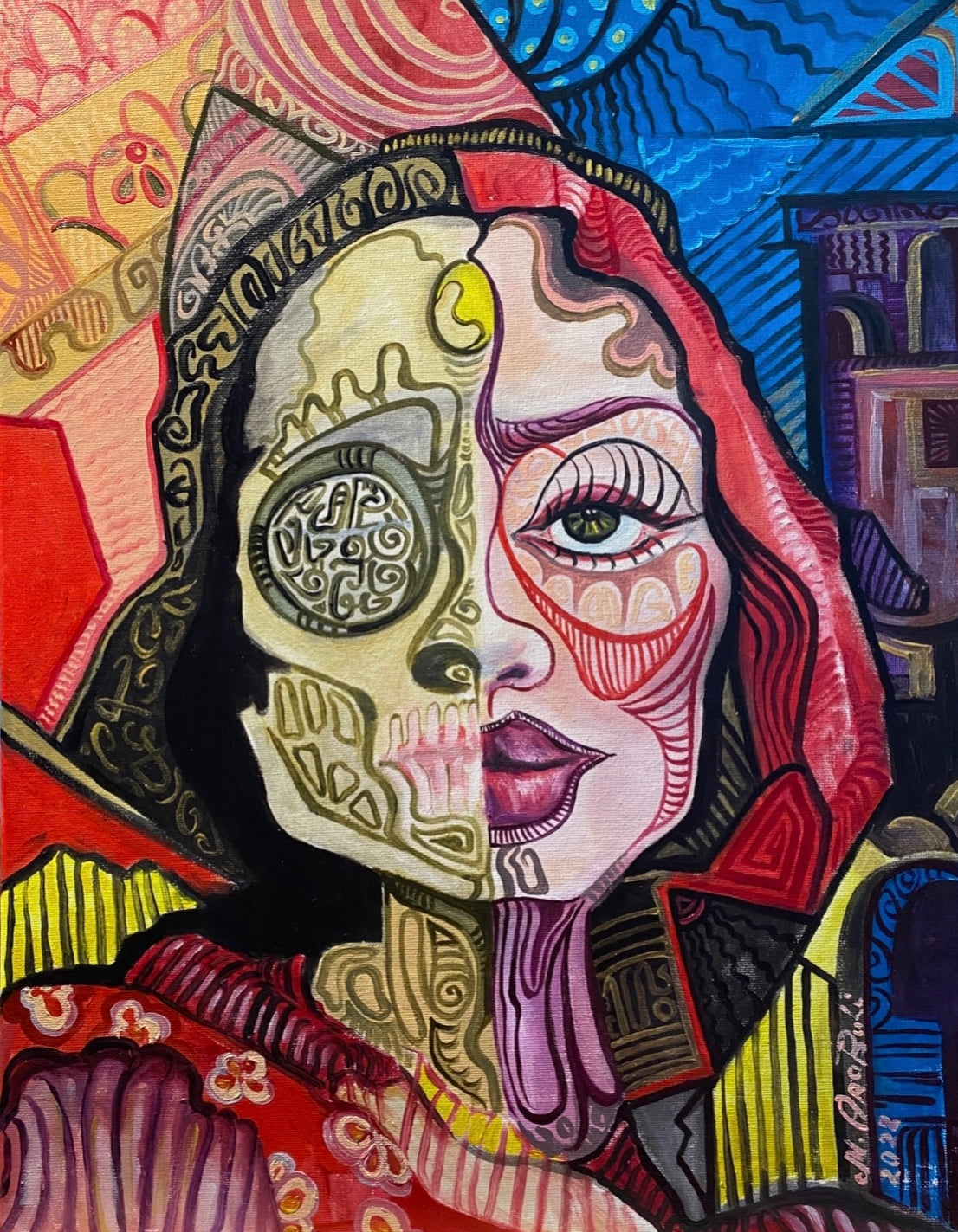 This artwork is a unique fusion of abstract, surreal, and symbolic styles, brought to life with vivid colors, dynamic shapes, and intricate linework. It’s more than a painting — it’s a visual meditation on beauty, impermanence, and the human experience.