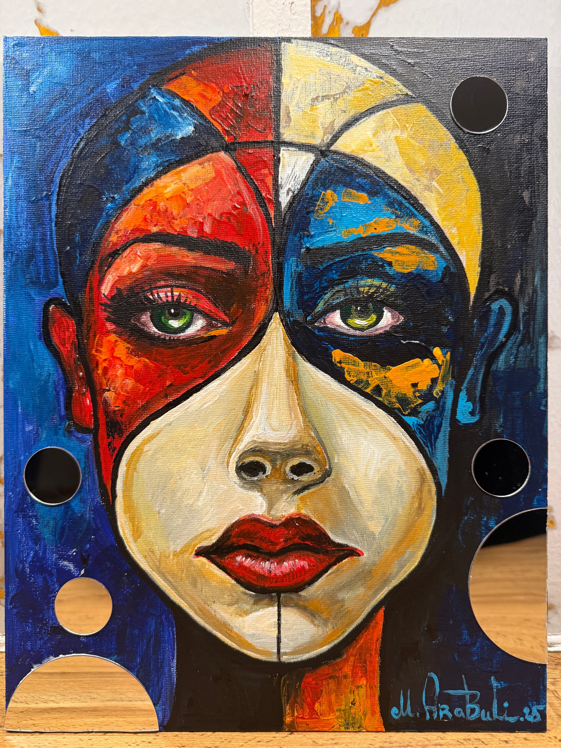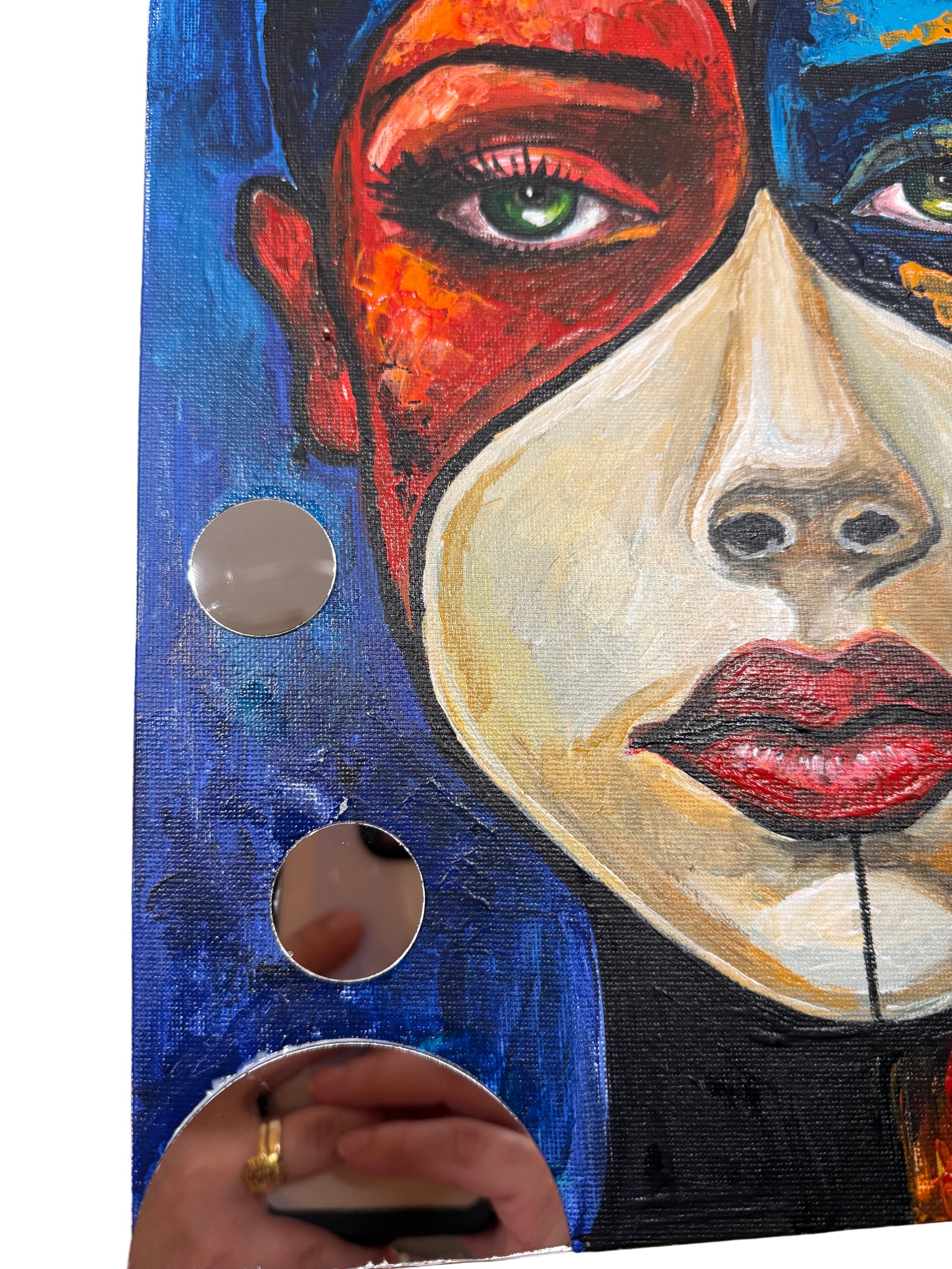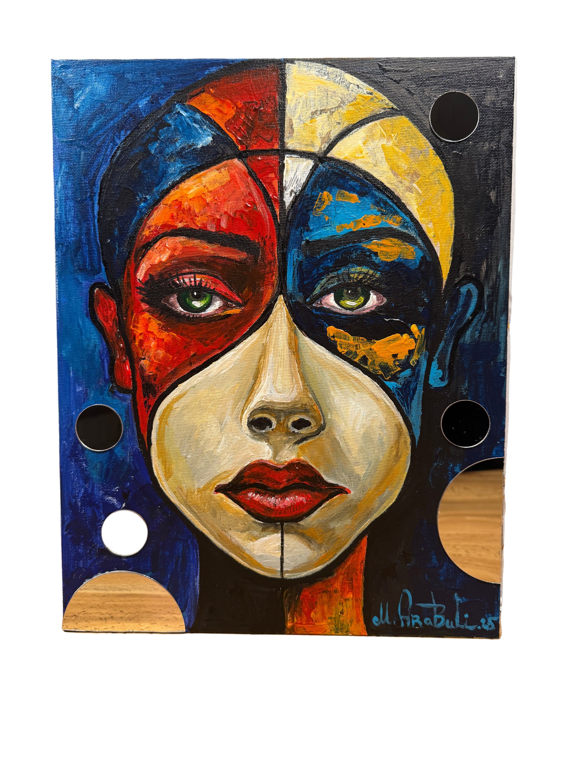 Mirror Within explores the connection between self-perception and the fragmented reflections that shape identity. The mirrored elements invite viewers to see themselves within the portrait — a reminder that we are all a mosaic of emotions, colors, and contrasts.