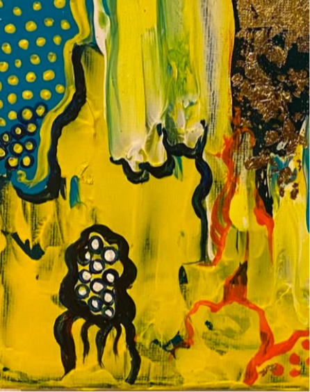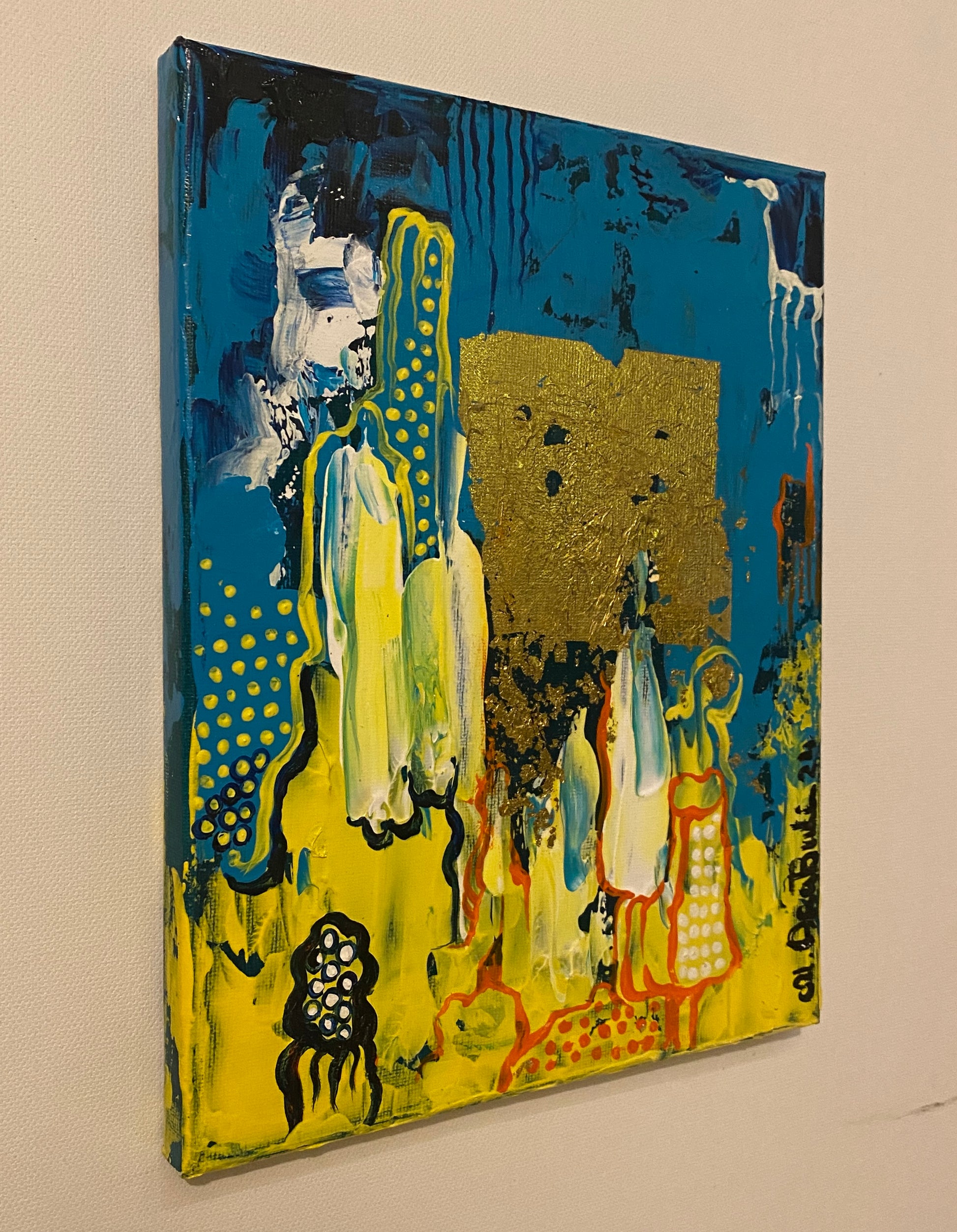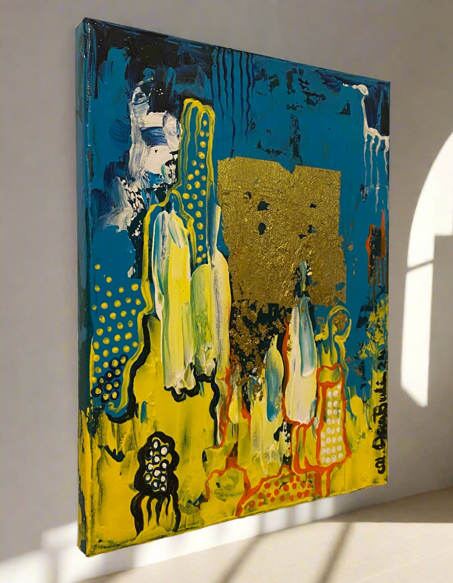 Molecular is an abstract mixed media artwork where science meets artistic intuition. Bursting with energy, it features vivid yellows, rich teals, layered textures, and a bold block of real gold leaf at the center. Drips, dots, and cell-like shapes evoke molecular structures, microscopic life, and dynamic transformation.