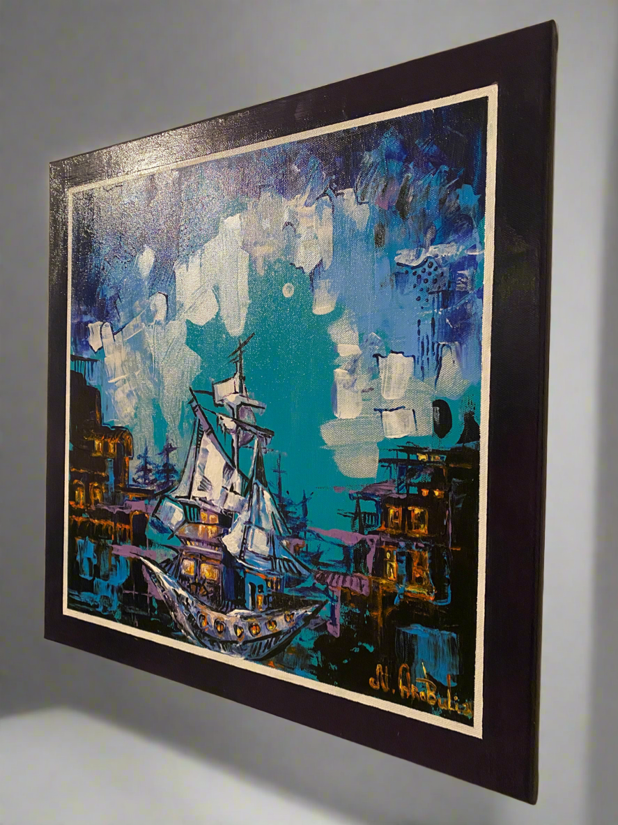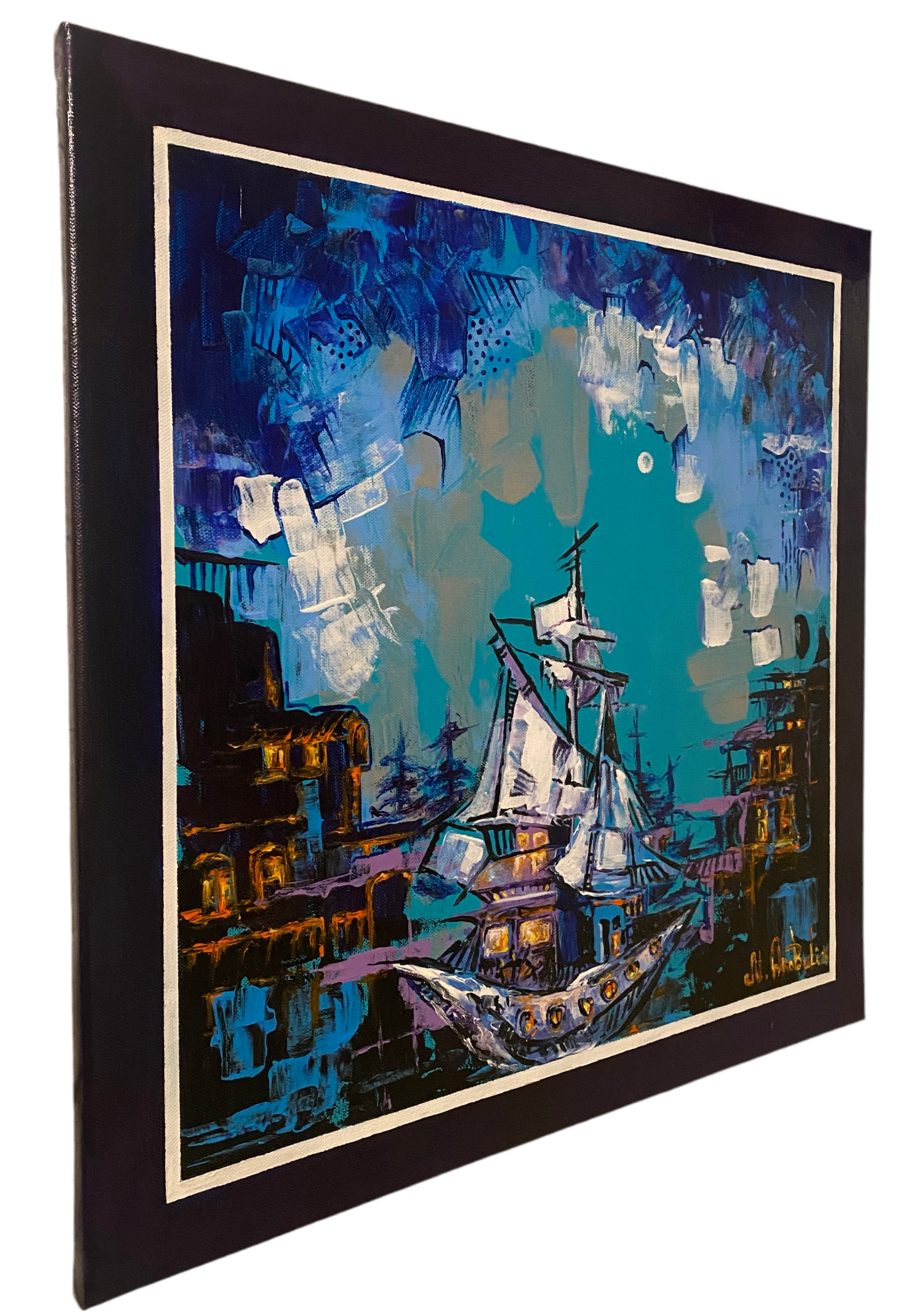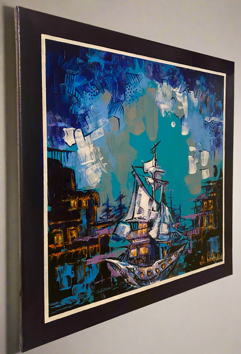 Sail into a dreamscape with Moonlight Ghost, an enchanting acrylic painting that captures the haunting beauty of a ship drifting under a glowing moonlit sky. Bold brushstrokes of deep blues, bright turquoise, and luminous whites create a mystical night scene, while glowing windows hint at life within the ghostly ship and distant harbors. This piece combines elements of abstract expression and surreal atmosphere, bringing a sense of adventure, mystery, and wonder to any space.