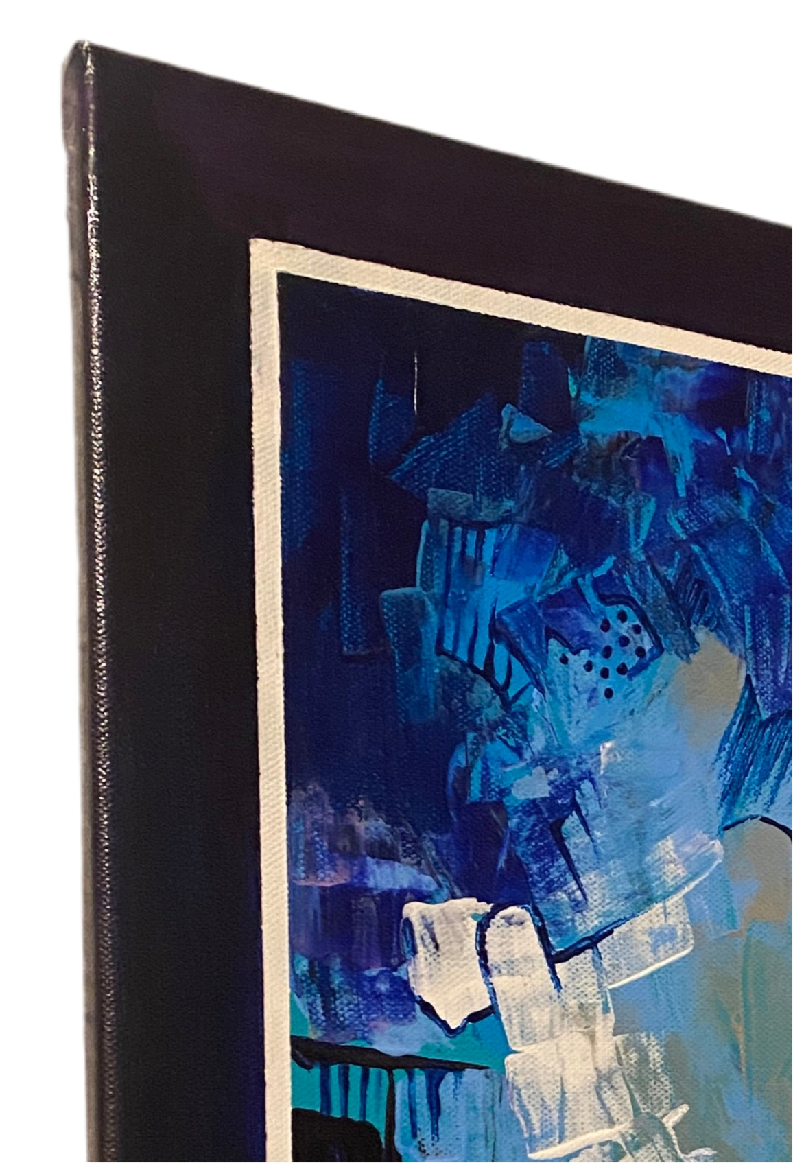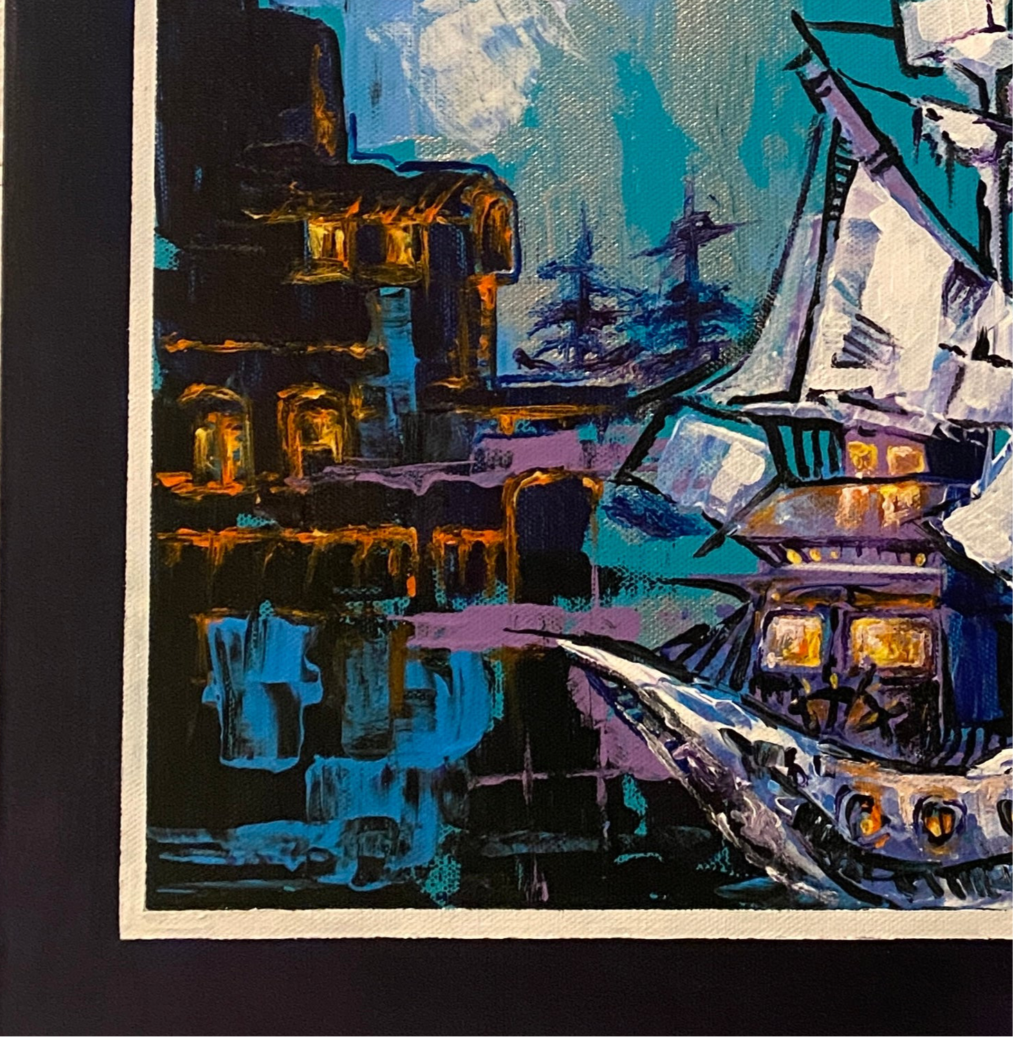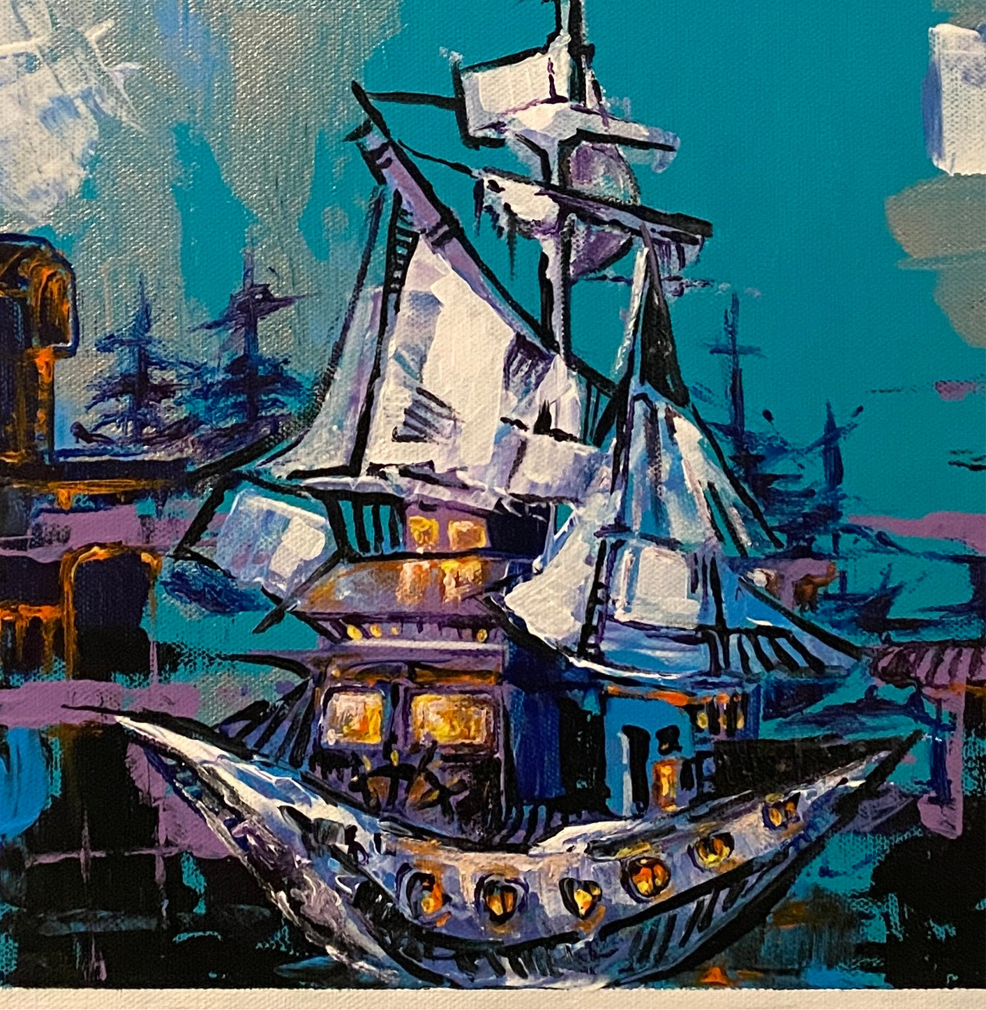 Sail into a dreamscape with Moonlight Ghost, an enchanting acrylic painting that captures the haunting beauty of a ship drifting under a glowing moonlit sky. Bold brushstrokes of deep blues, bright turquoise, and luminous whites create a mystical night scene, while glowing windows hint at life within the ghostly ship and distant harbors. This piece combines elements of abstract expression and surreal atmosphere, bringing a sense of adventure, mystery, and wonder to any space.