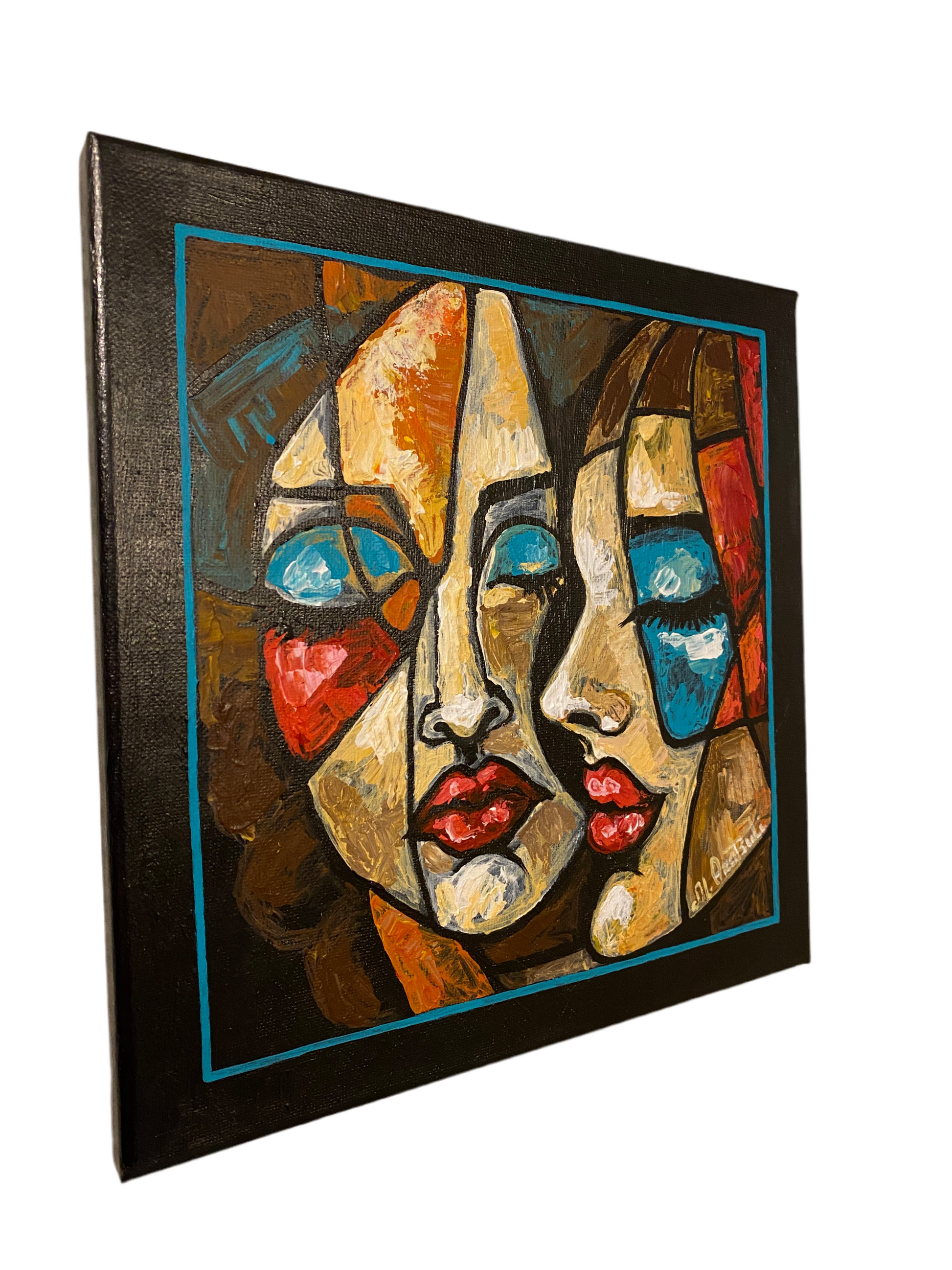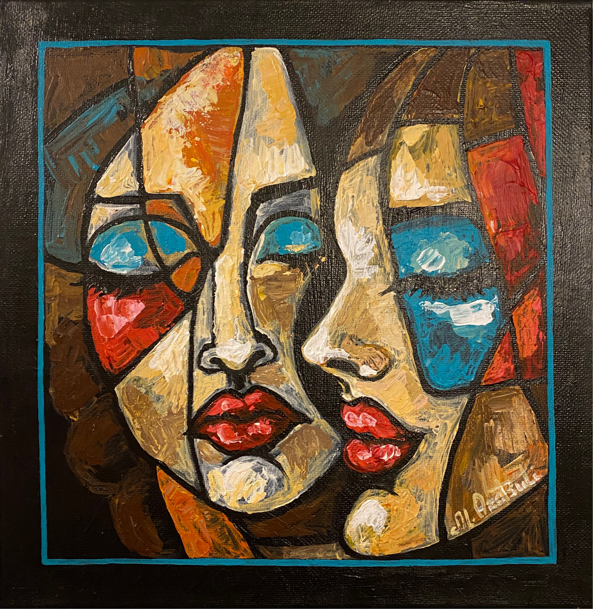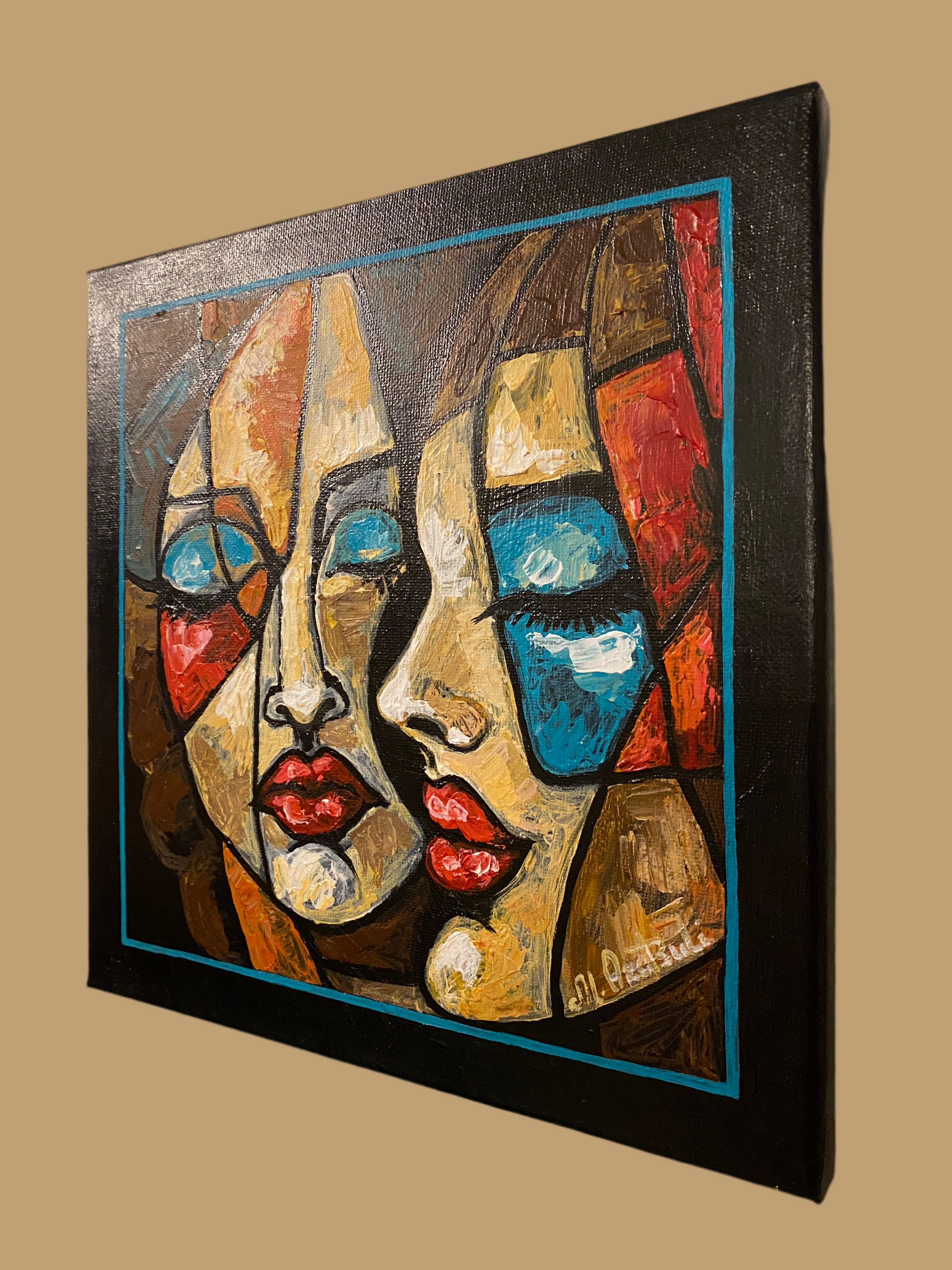 Immerse yourself in the bold emotional expression of One Soul, an original acrylic painting by Georgian artist Maia Arabuli. This 10x10 inch canvas bursts with raw color and layered abstraction, depicting two interconnected faces that symbolize unity, duality, and deep human connection. Rich reds, earthy browns, and vibrant blues form an evocative visual narrative framed with striking contrast and depth.