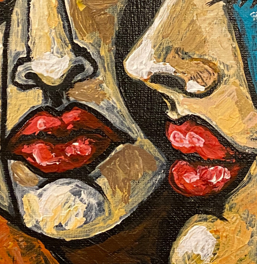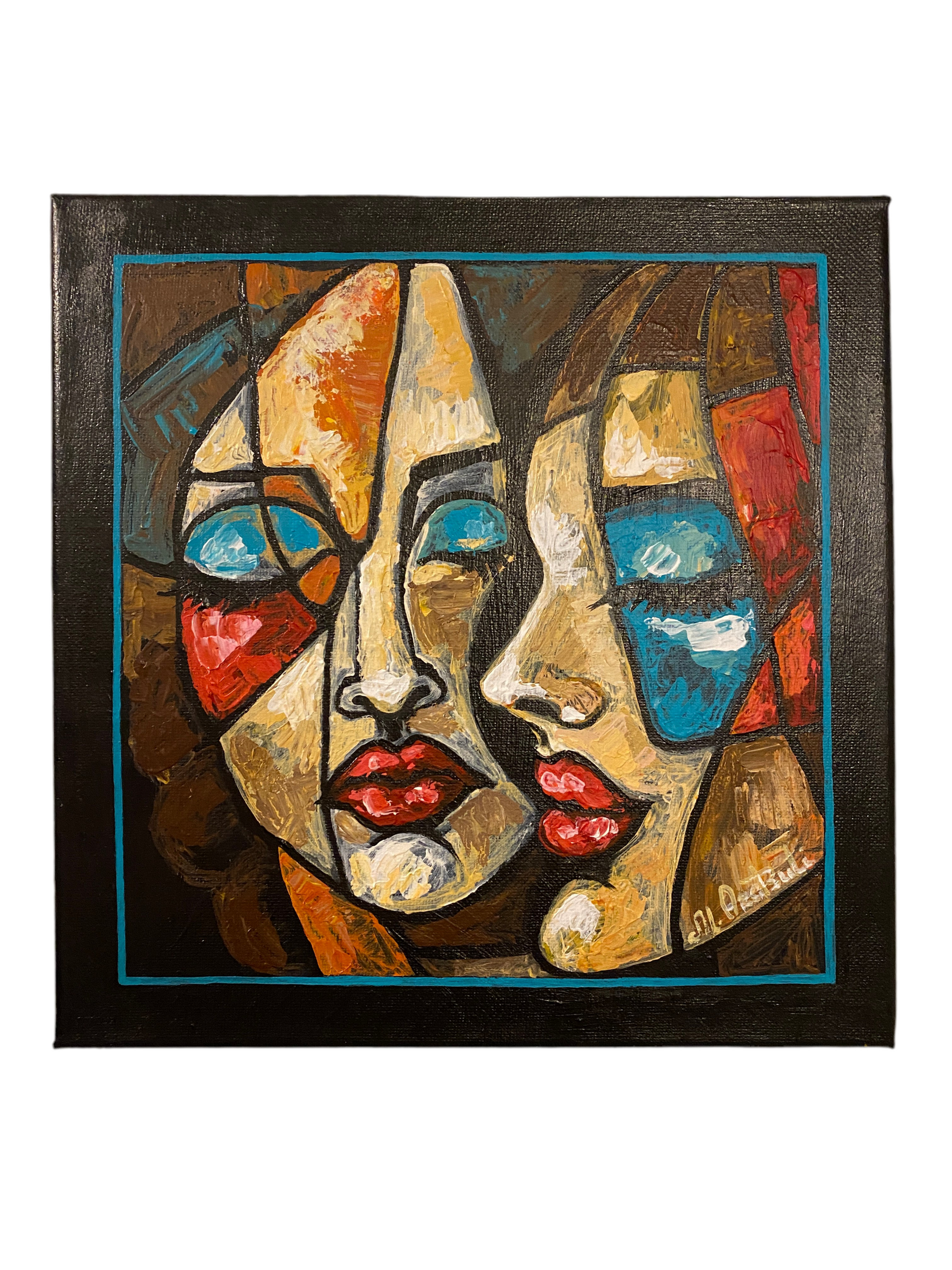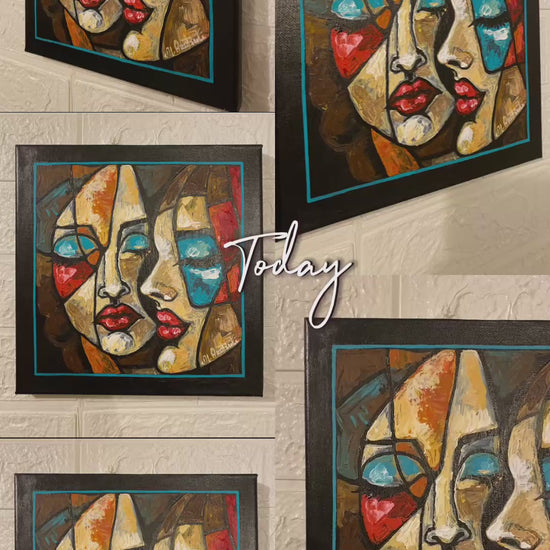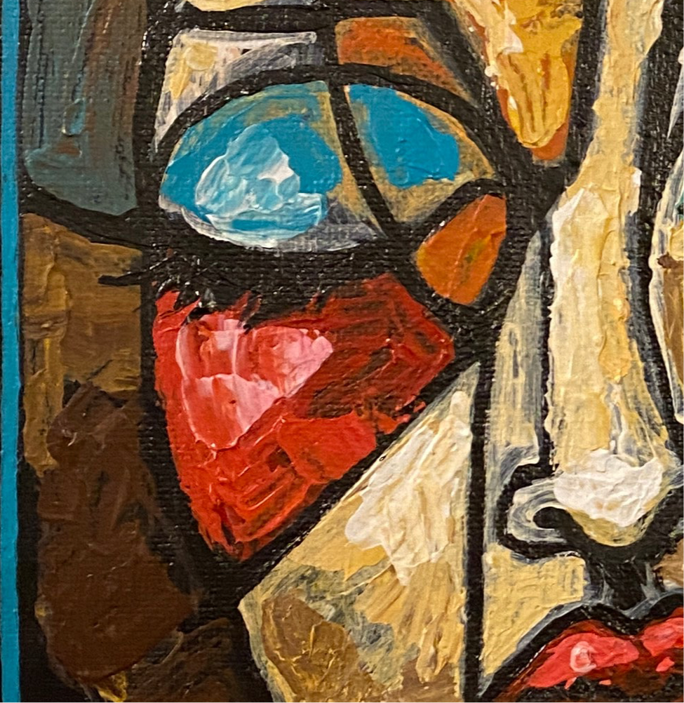 Immerse yourself in the bold emotional expression of One Soul, an original acrylic painting by Georgian artist Maia Arabuli. This 10x10 inch canvas bursts with raw color and layered abstraction, depicting two interconnected faces that symbolize unity, duality, and deep human connection. Rich reds, earthy browns, and vibrant blues form an evocative visual narrative framed with striking contrast and depth.