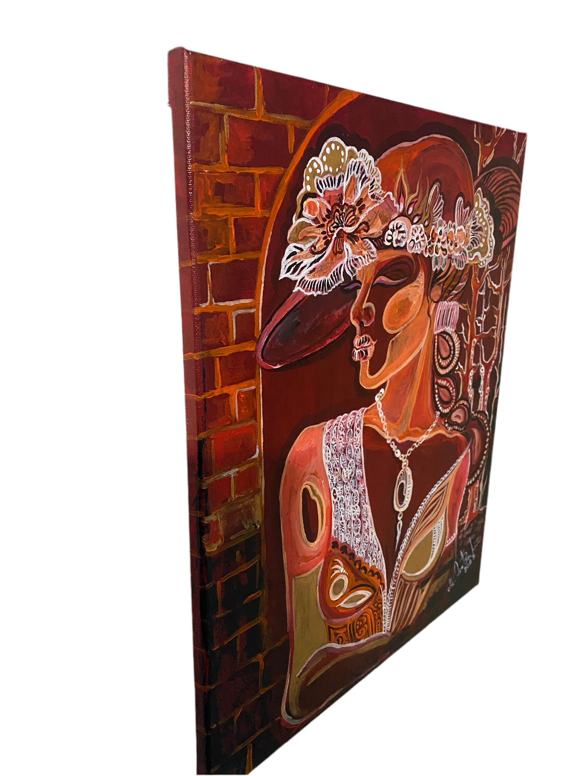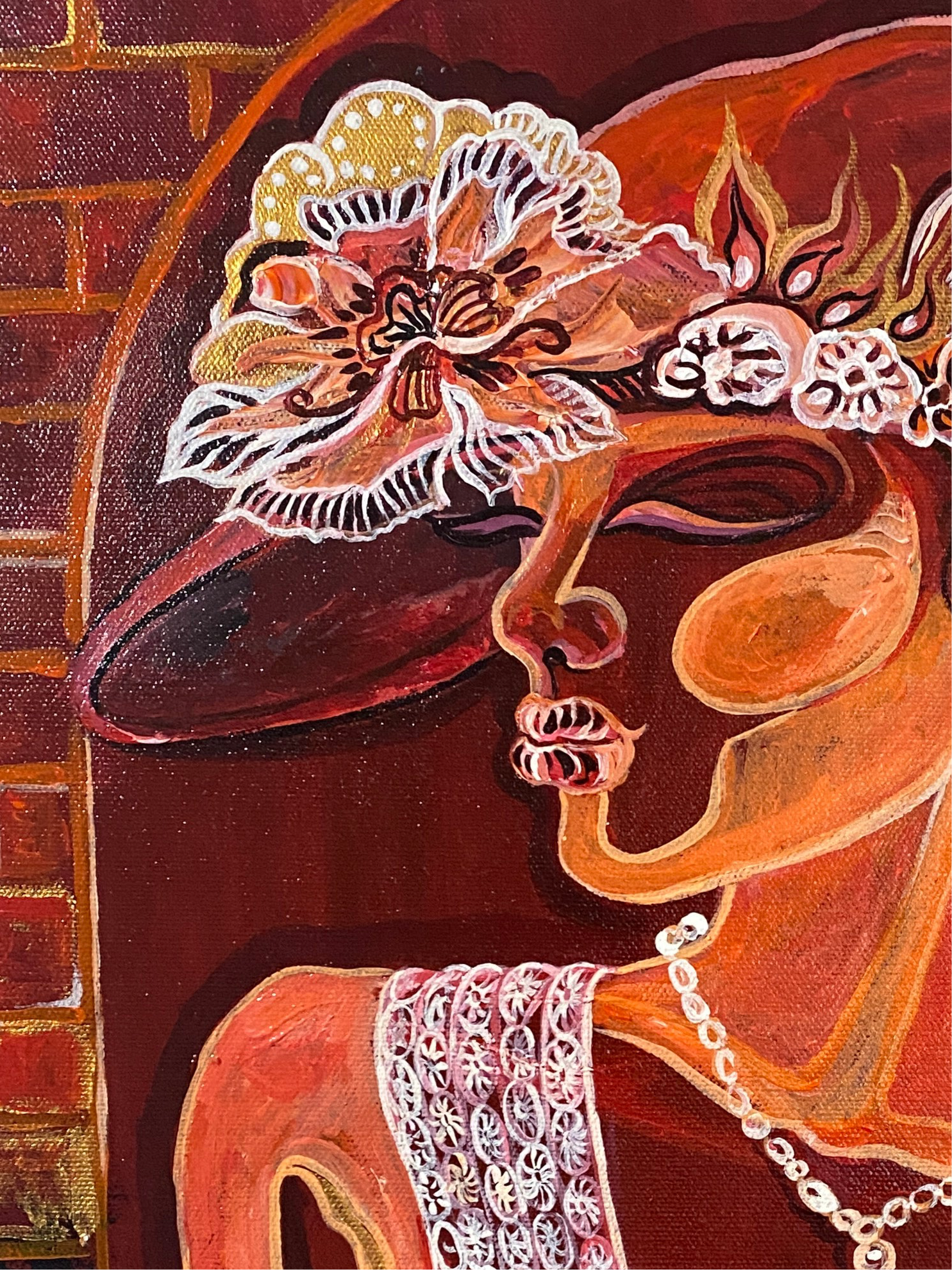 Set against a textured backdrop of brick and abstract forms, this piece radiates warmth, mystery, and sophistication. A celebration of feminine energy, this painting makes a statement in any space.