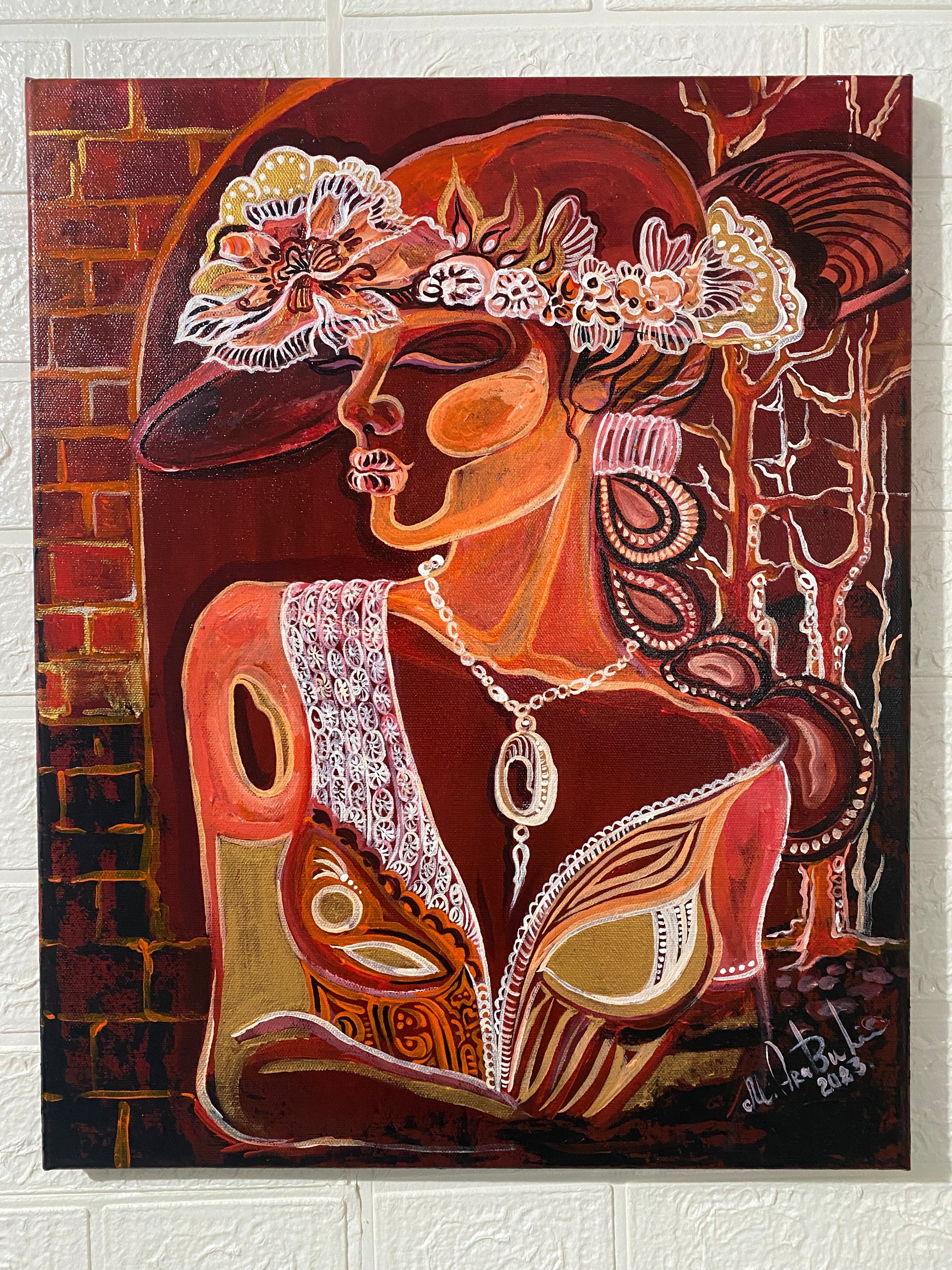 Perfection on the Earth captures the divine beauty and grace of womanhood through bold, expressive lines and rich earthy tones. This original acrylic painting features a powerful female figure adorned with intricate details—floral headwear, delicate lace textures, and symbolic patterns that speak of inner strength, elegance, and heritage.