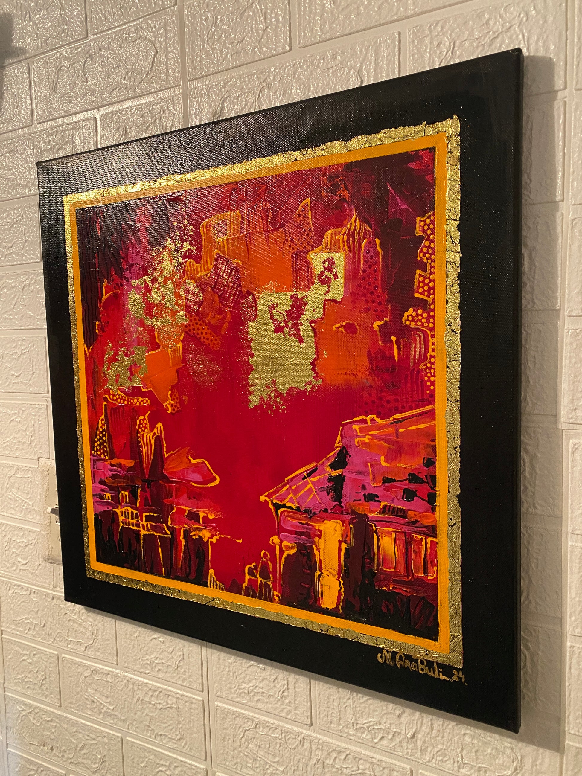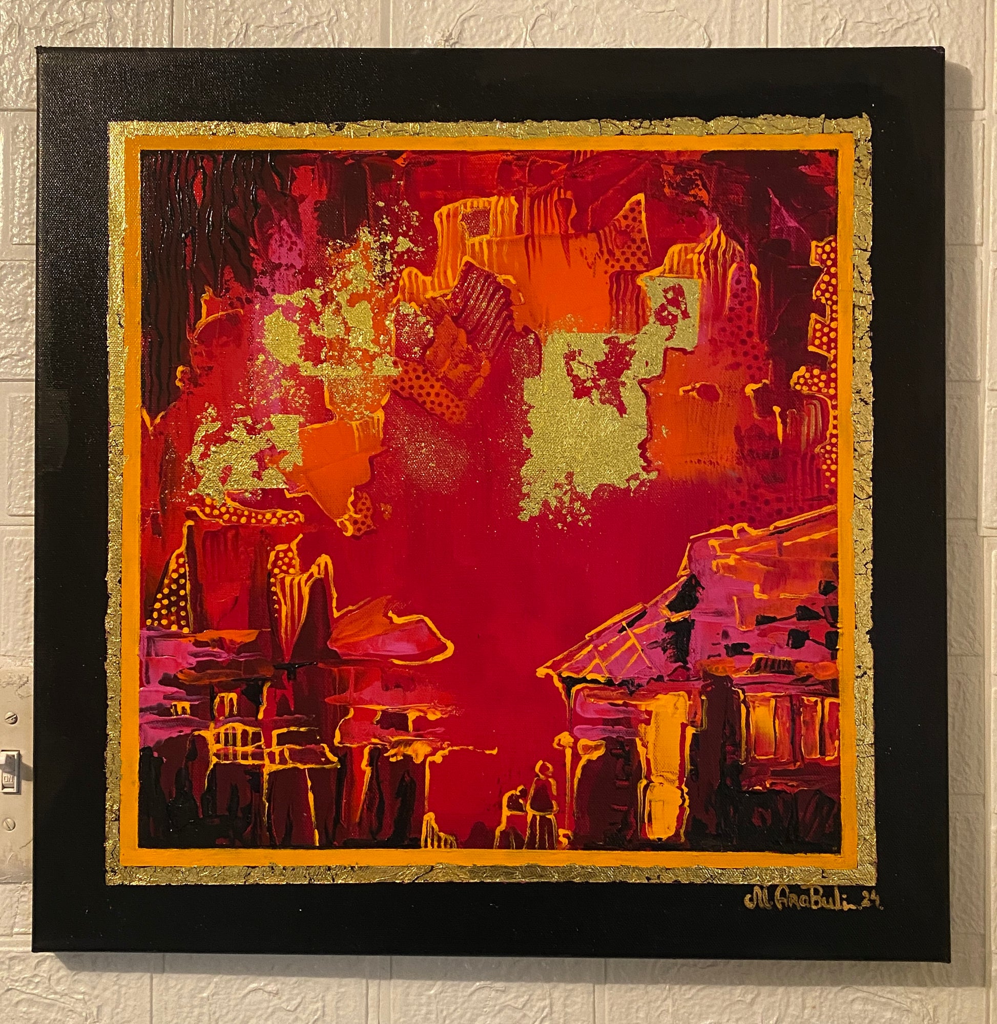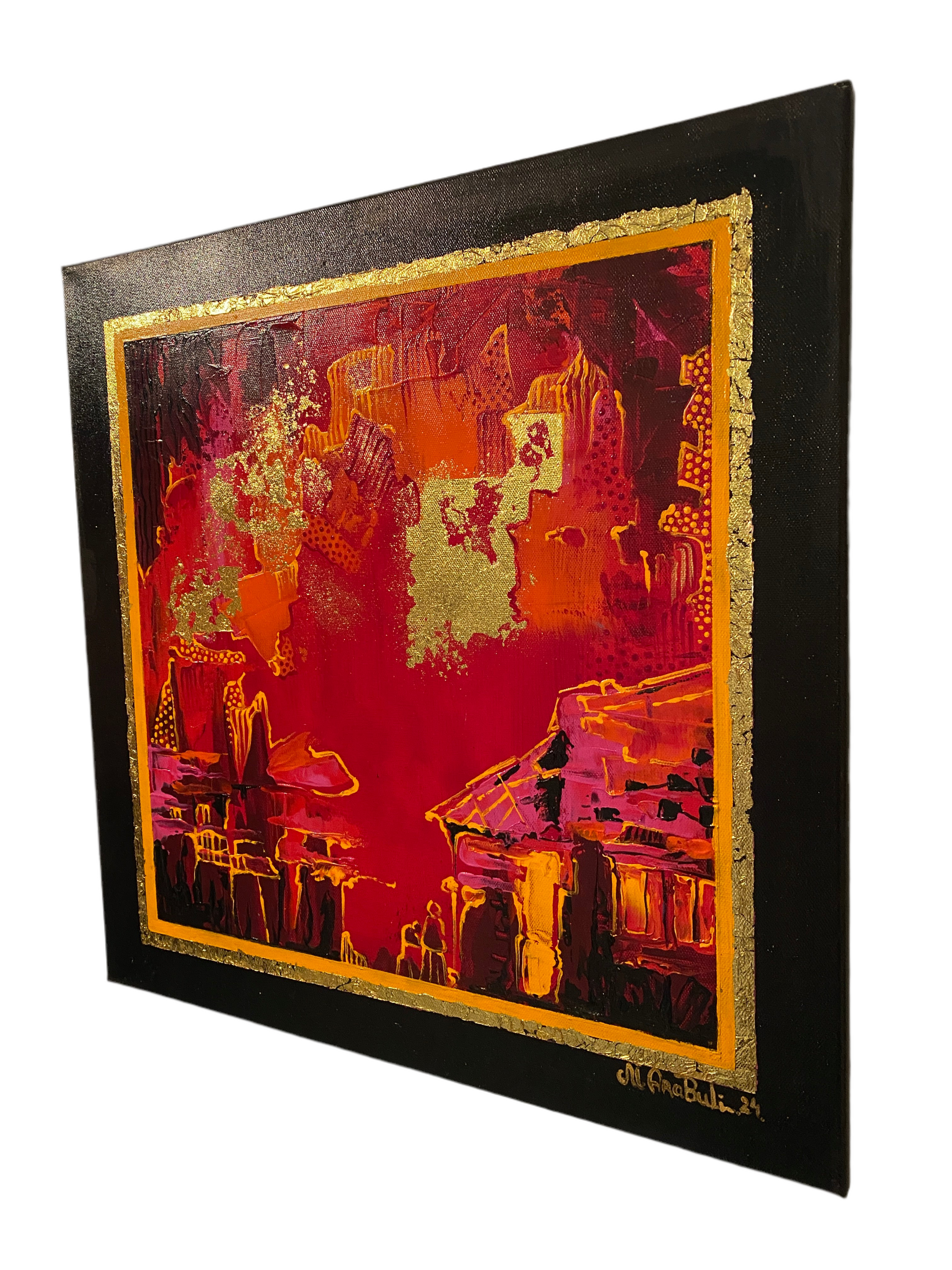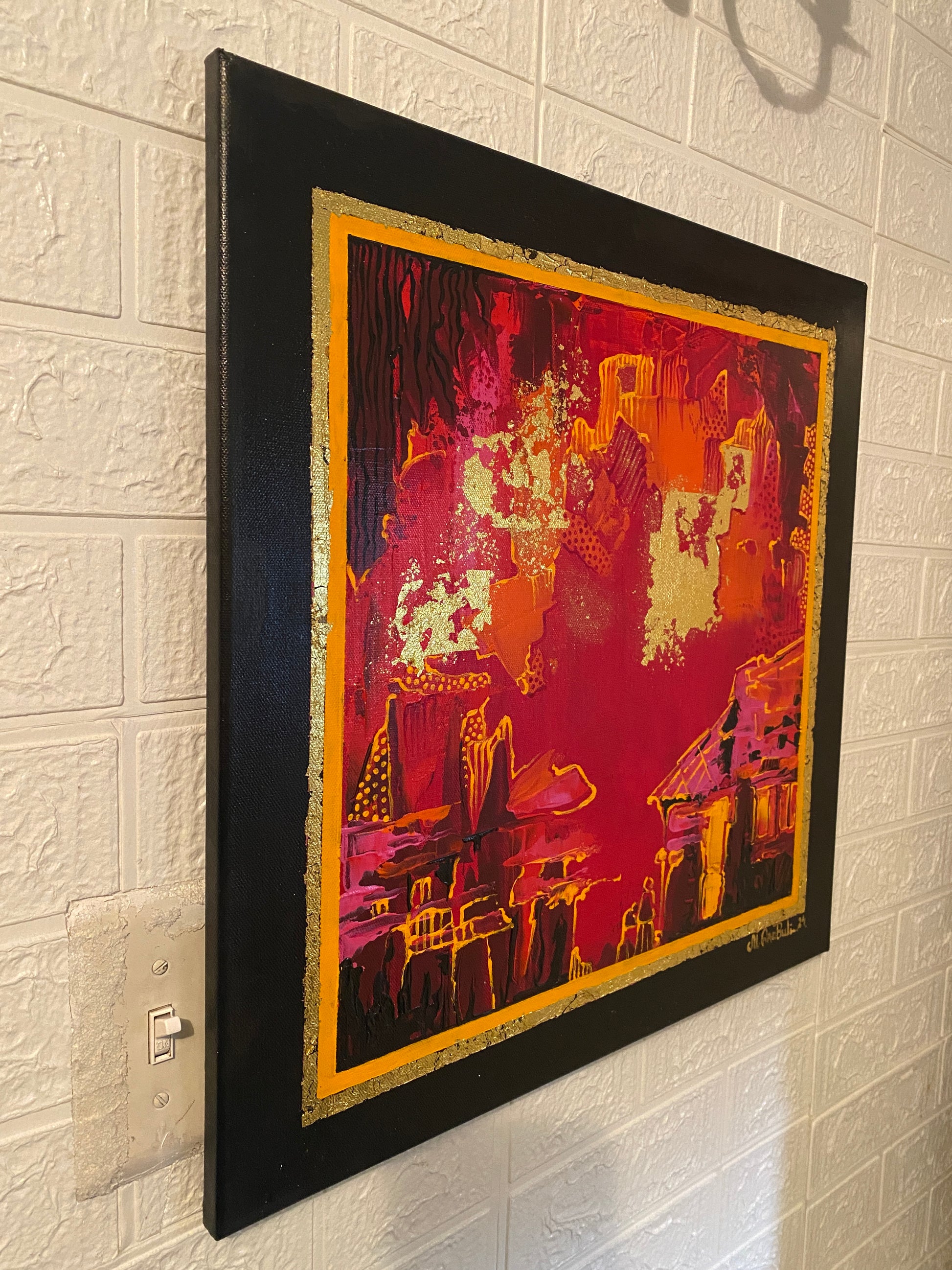 Immerse yourself in the vibrant energy of “Red Dimension”, a one-of-a-kind abstract original by Georgian artist Maia Arabuli. This 20x20 inch acrylic painting on canvas fuses fiery reds, oranges, and purples with the shimmering elegance of gold leaf accents. Layered textures and architectural silhouettes create a glowing, dreamlike cityscape that evokes emotion and intrigue.