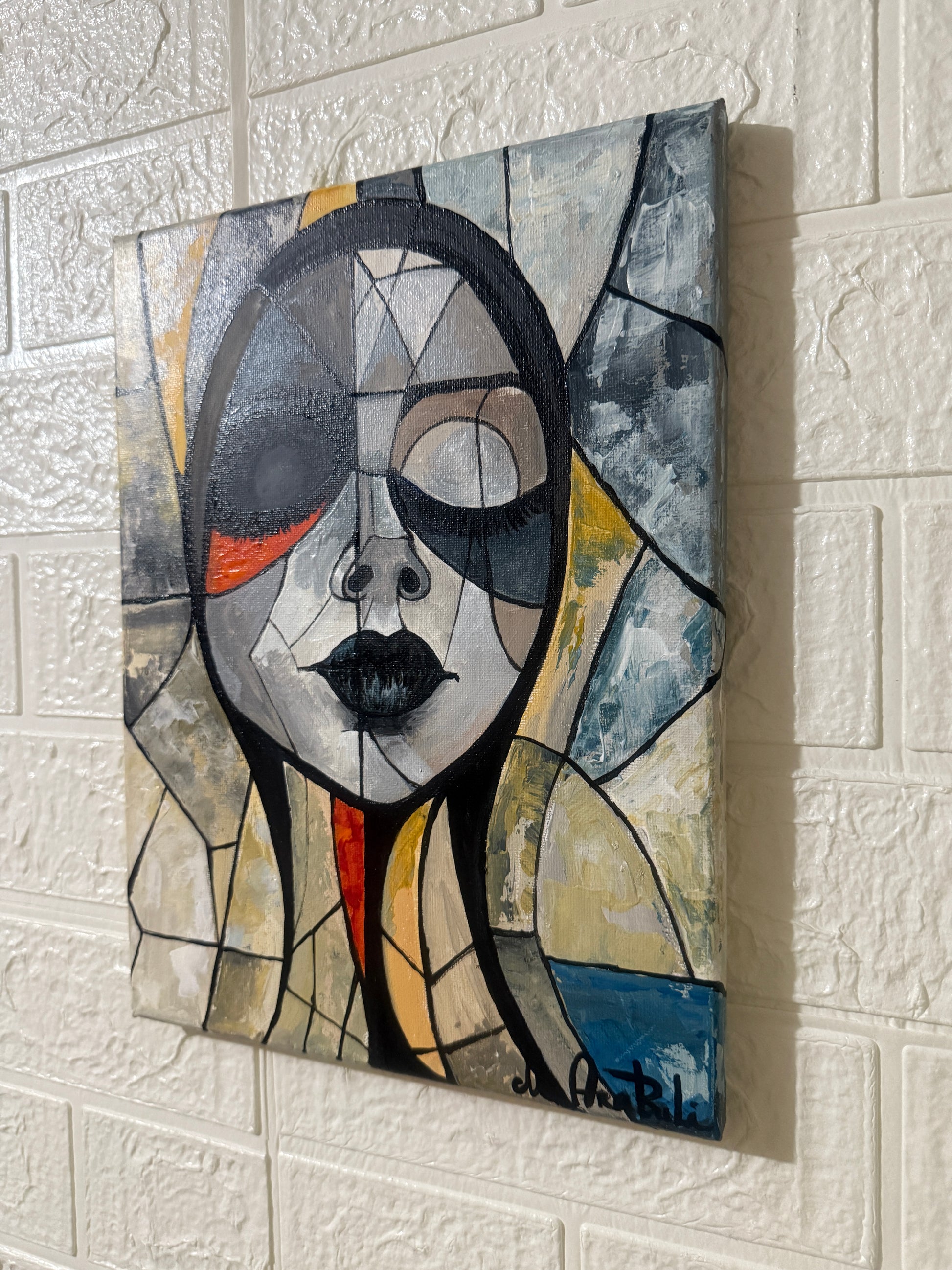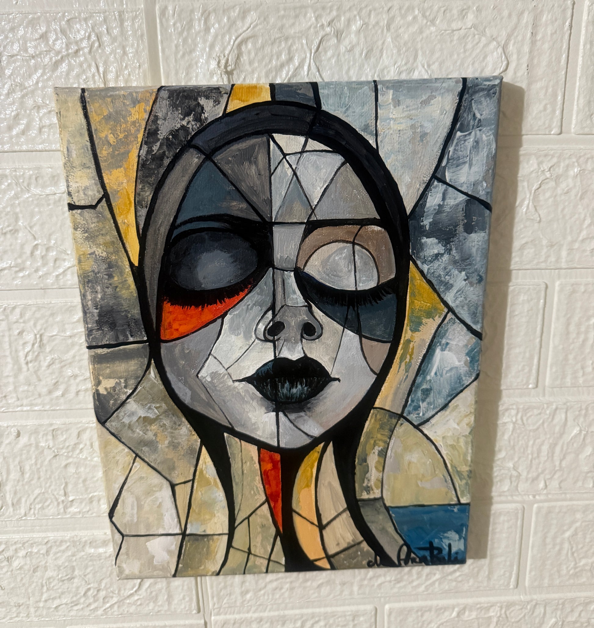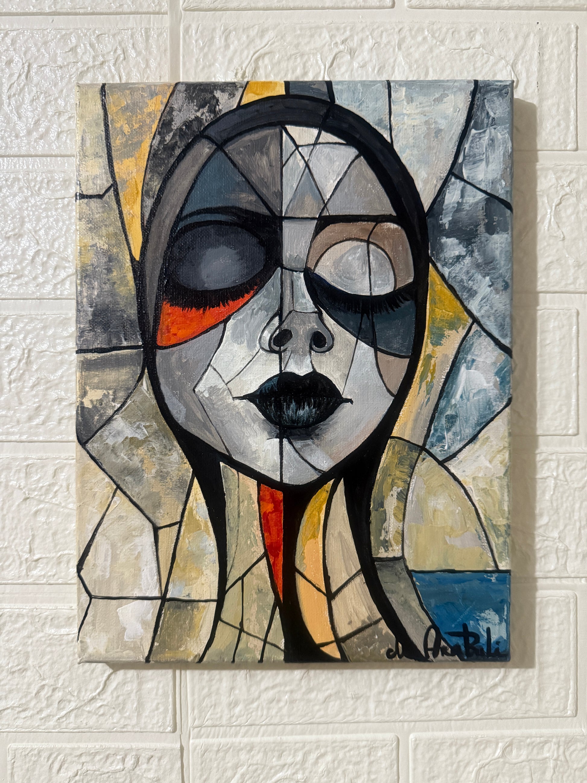 The Inner Window is a cubist exploration of introspection and quiet strength. Fragmented geometric shapes form a serene face with closed eyes, symbolizing the balance between inner silence and hidden emotions. Bold accents of red, yellow, and blue break through the grayscale structure, suggesting moments of passion and clarity within the stillness. This work invites the viewer to pause and look beyond the surface—to the deeper windows of thought and soul