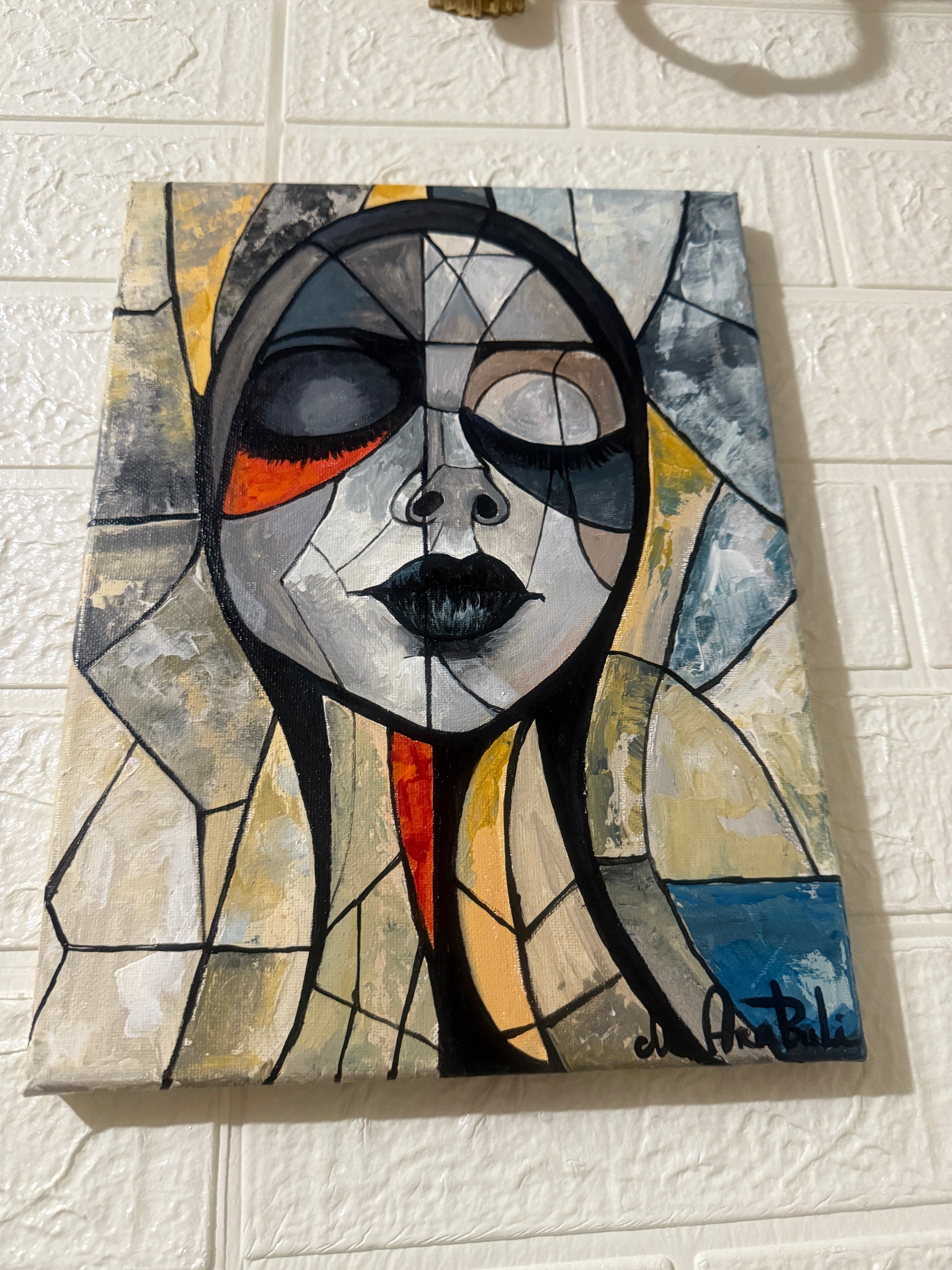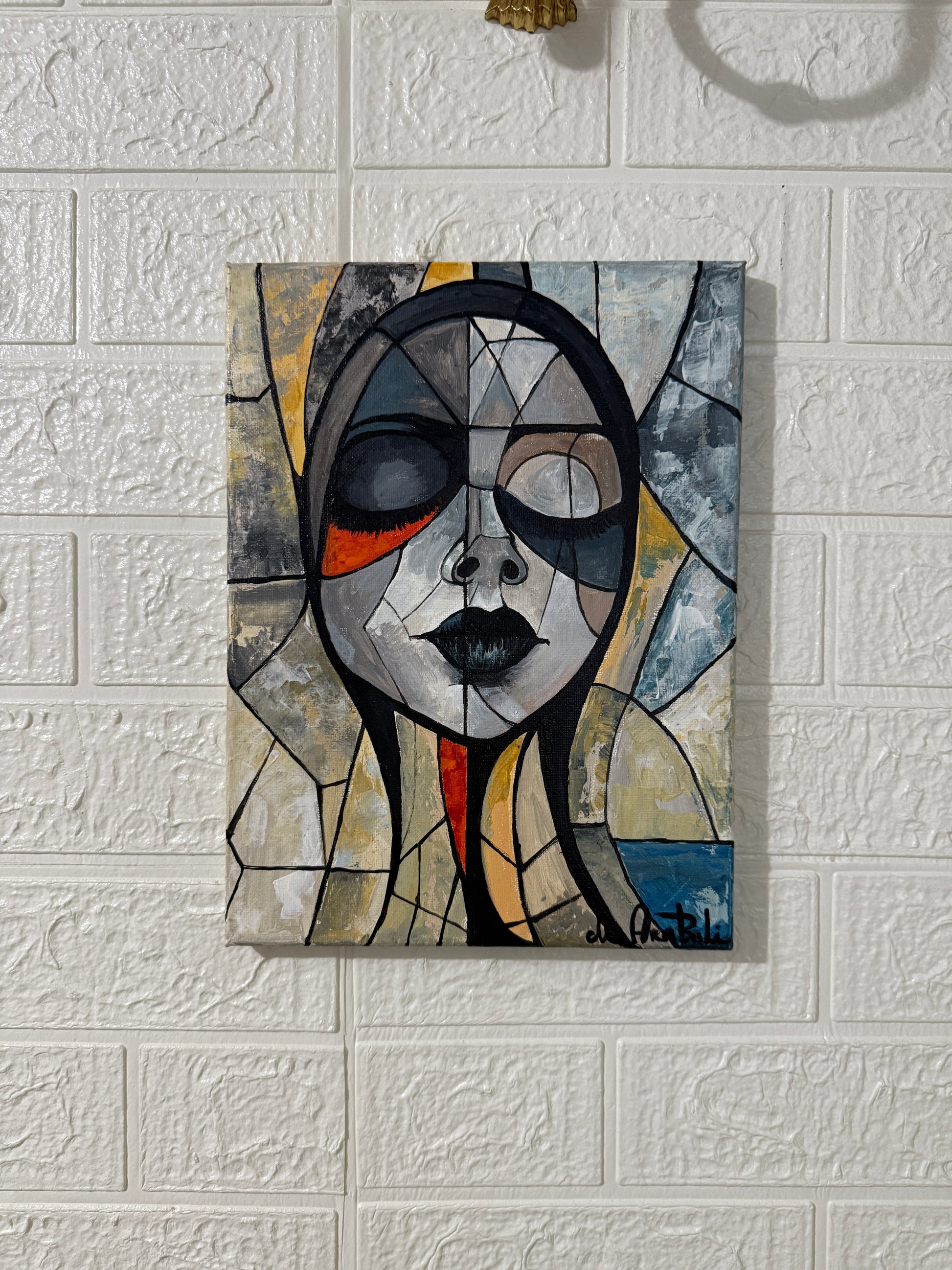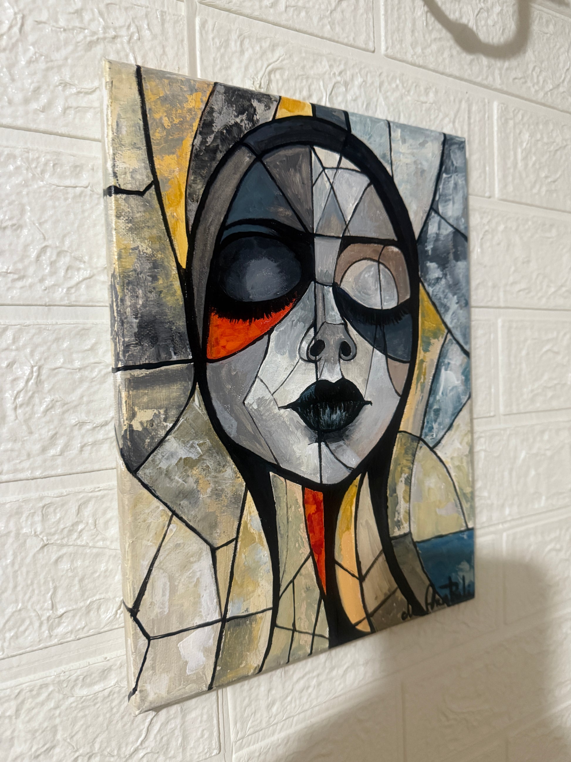 The Inner Window is a cubist exploration of introspection and quiet strength. Fragmented geometric shapes form a serene face with closed eyes, symbolizing the balance between inner silence and hidden emotions. Bold accents of red, yellow, and blue break through the grayscale structure, suggesting moments of passion and clarity within the stillness. This work invites the viewer to pause and look beyond the surface—to the deeper windows of thought and soul