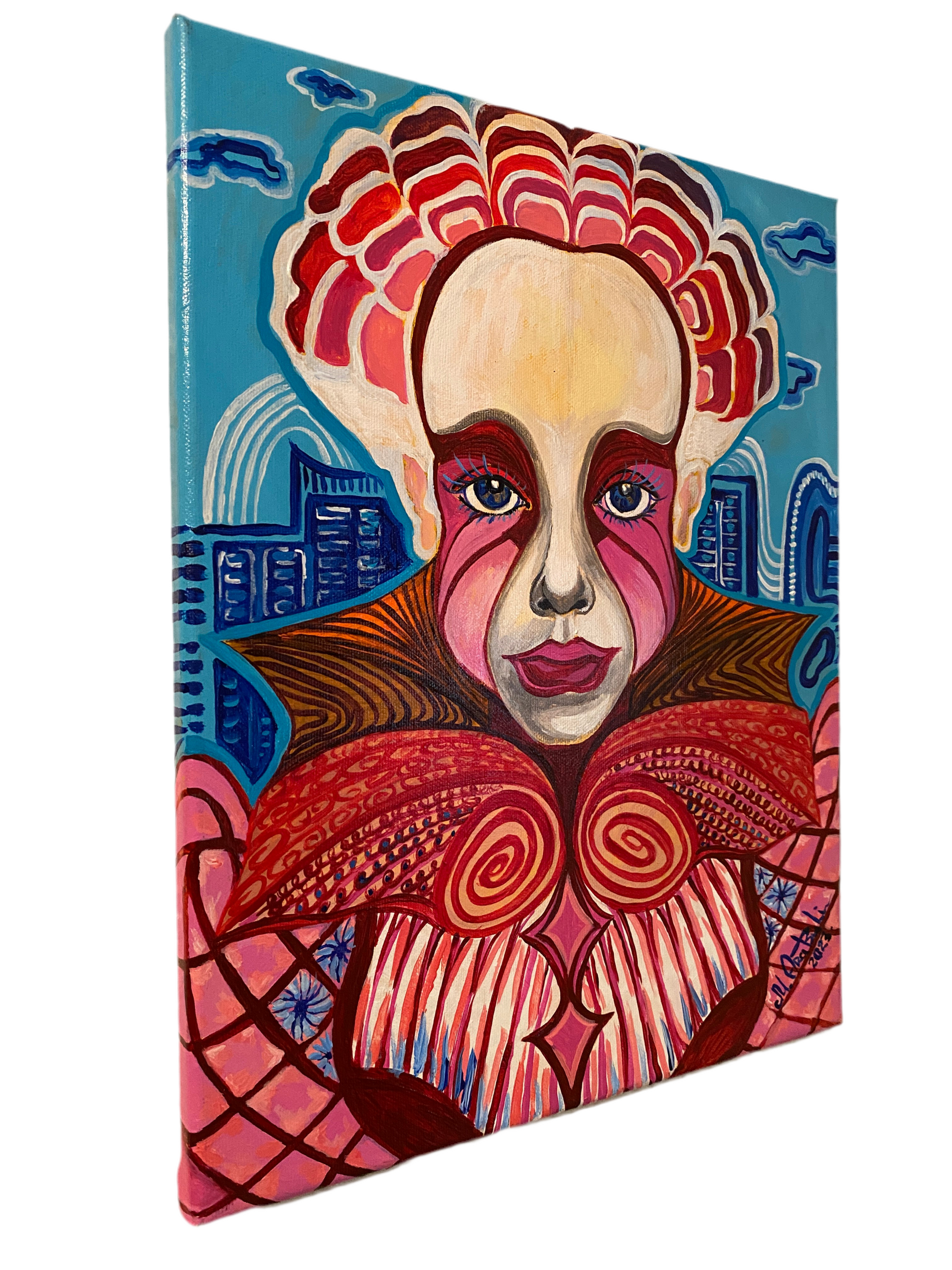 “Radiant Identity” is a vivid and expressive original painting that blends abstract, surreal, and modern influences. This striking portrait features a bold figure with an ornate, swirling costume and vibrant red and pink tones set against a playful blue cityscape background. Intricate patterns, dynamic brushstrokes, and intense eyes bring powerful emotion and energy to the composition.