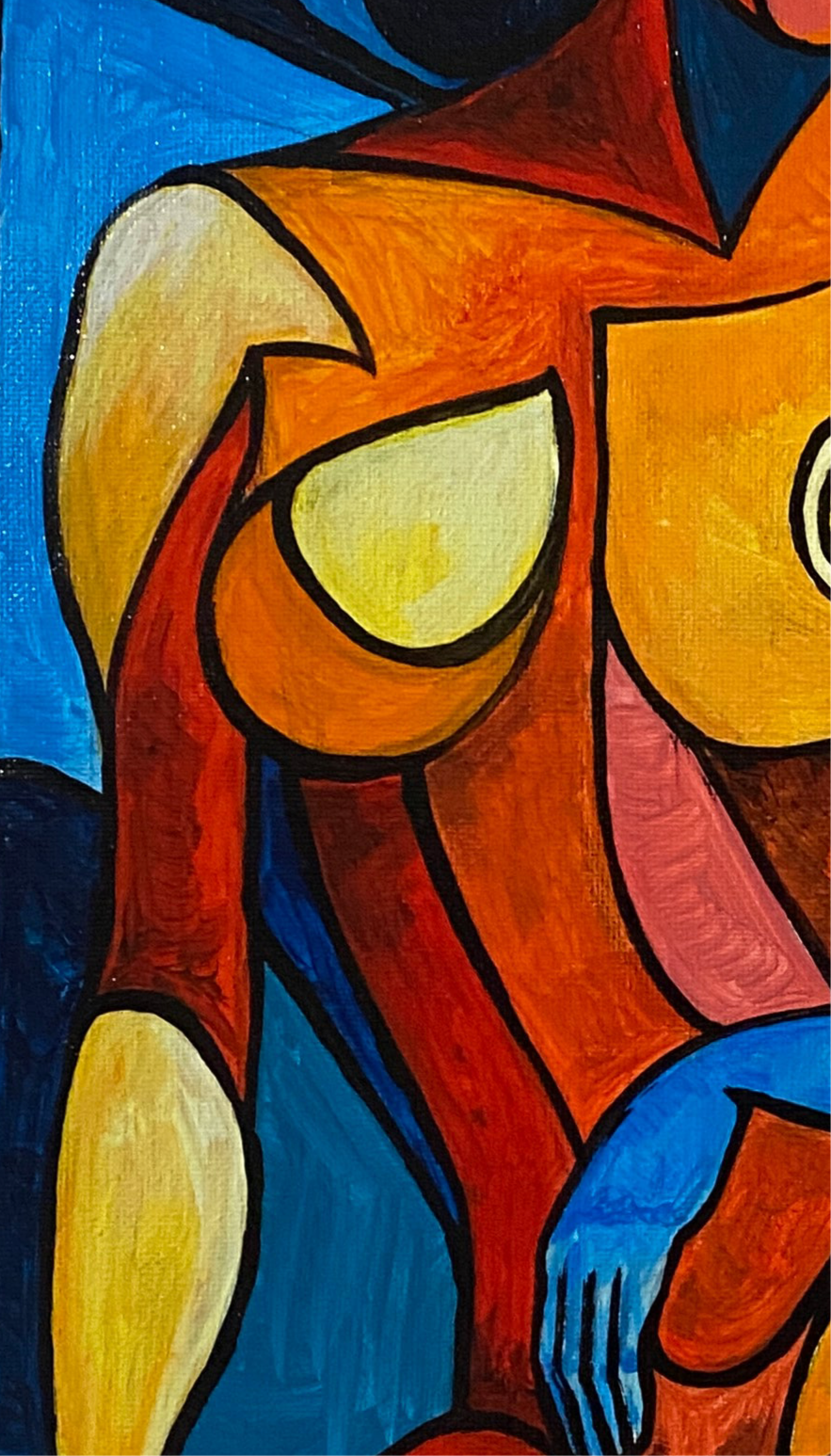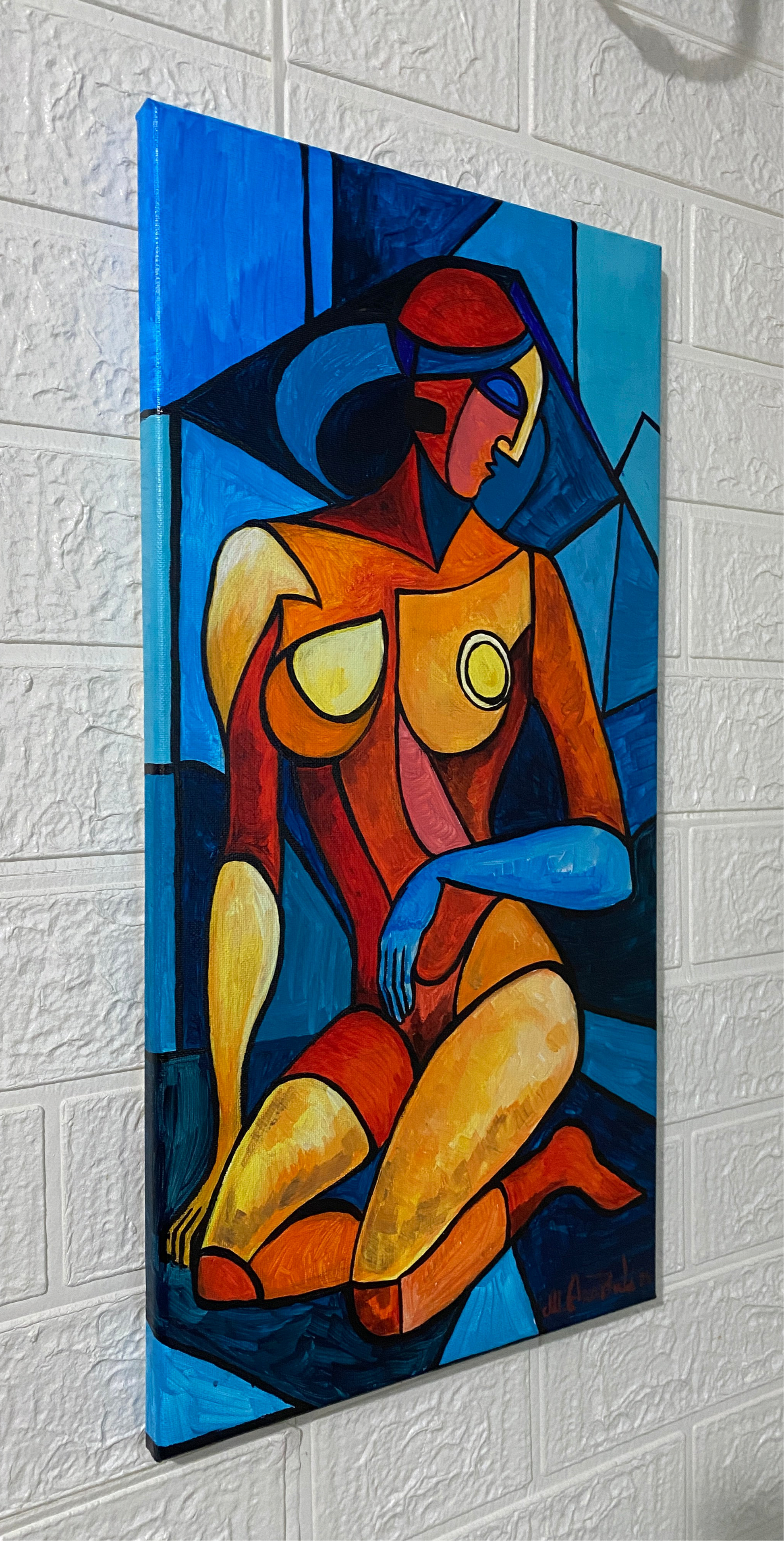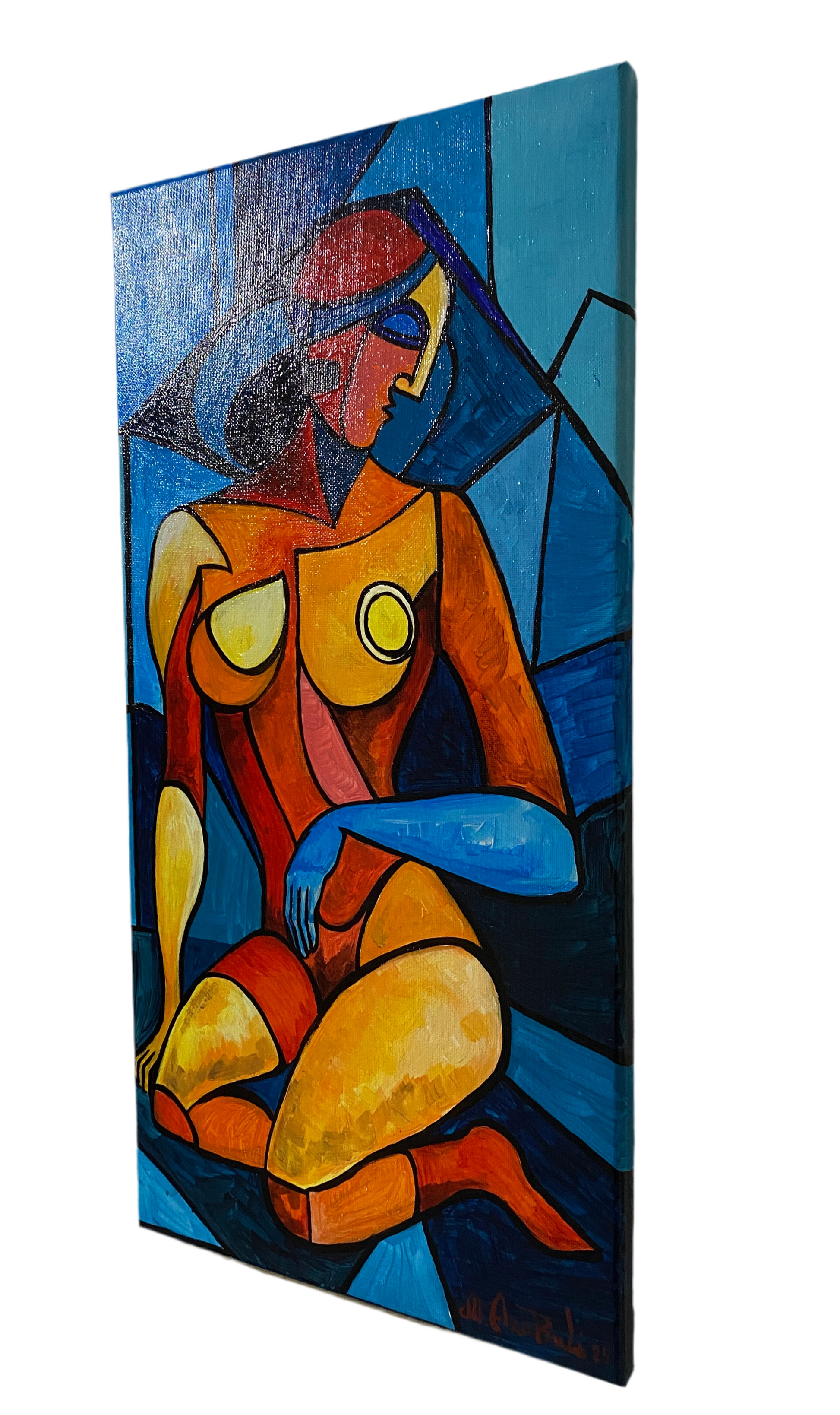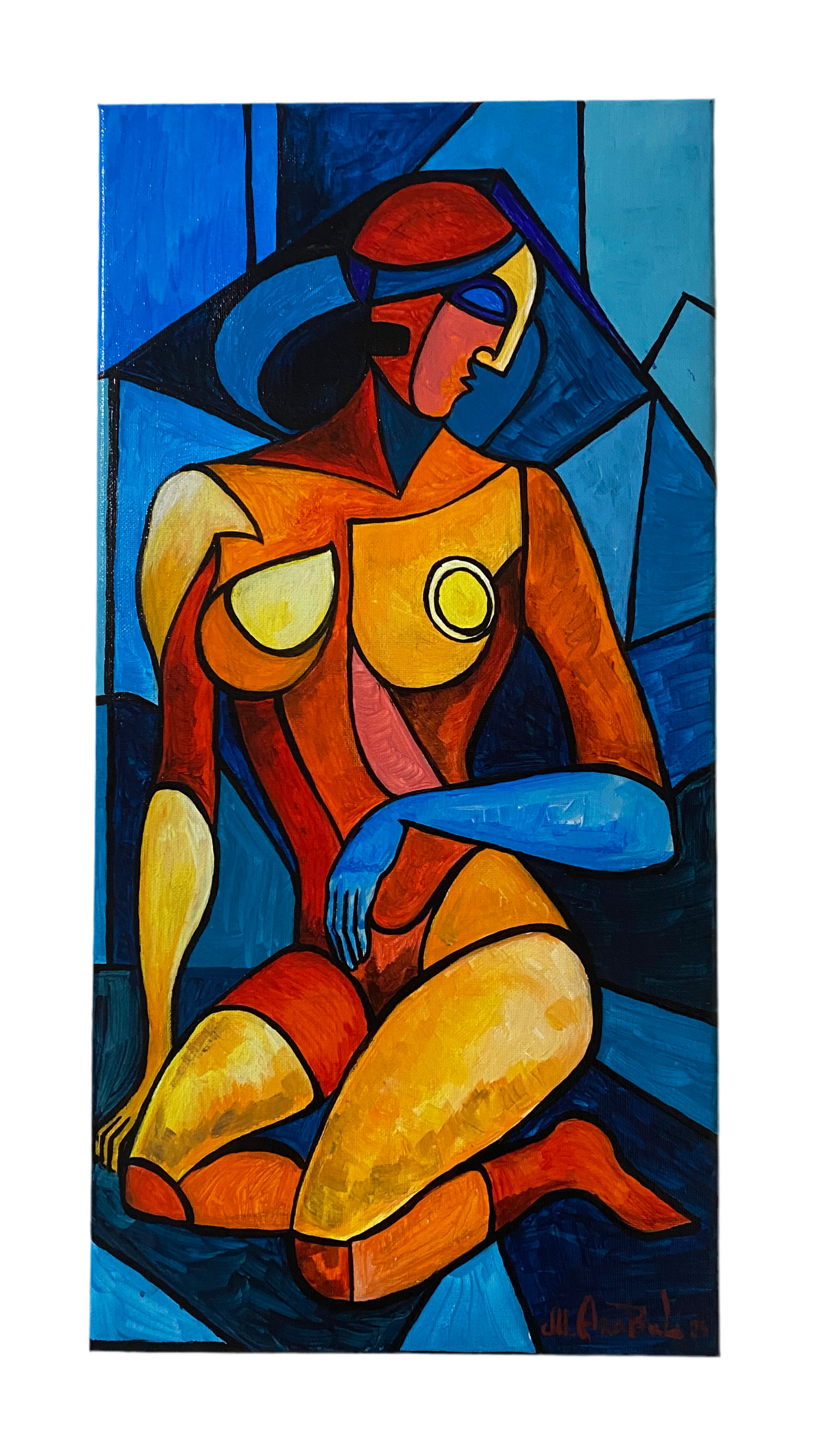 “Bold Reflections” is a striking original acrylic painting on canvas by Maia Arabuli, created in 2025. This 10x20 inch vertical piece captures a powerful female figure rendered in a vibrant cubist style, blending sharp geometric lines with rich, saturated colors. The interplay of warm oranges, deep blues, and glowing yellows evokes a sense of strength, introspection, and emotion.