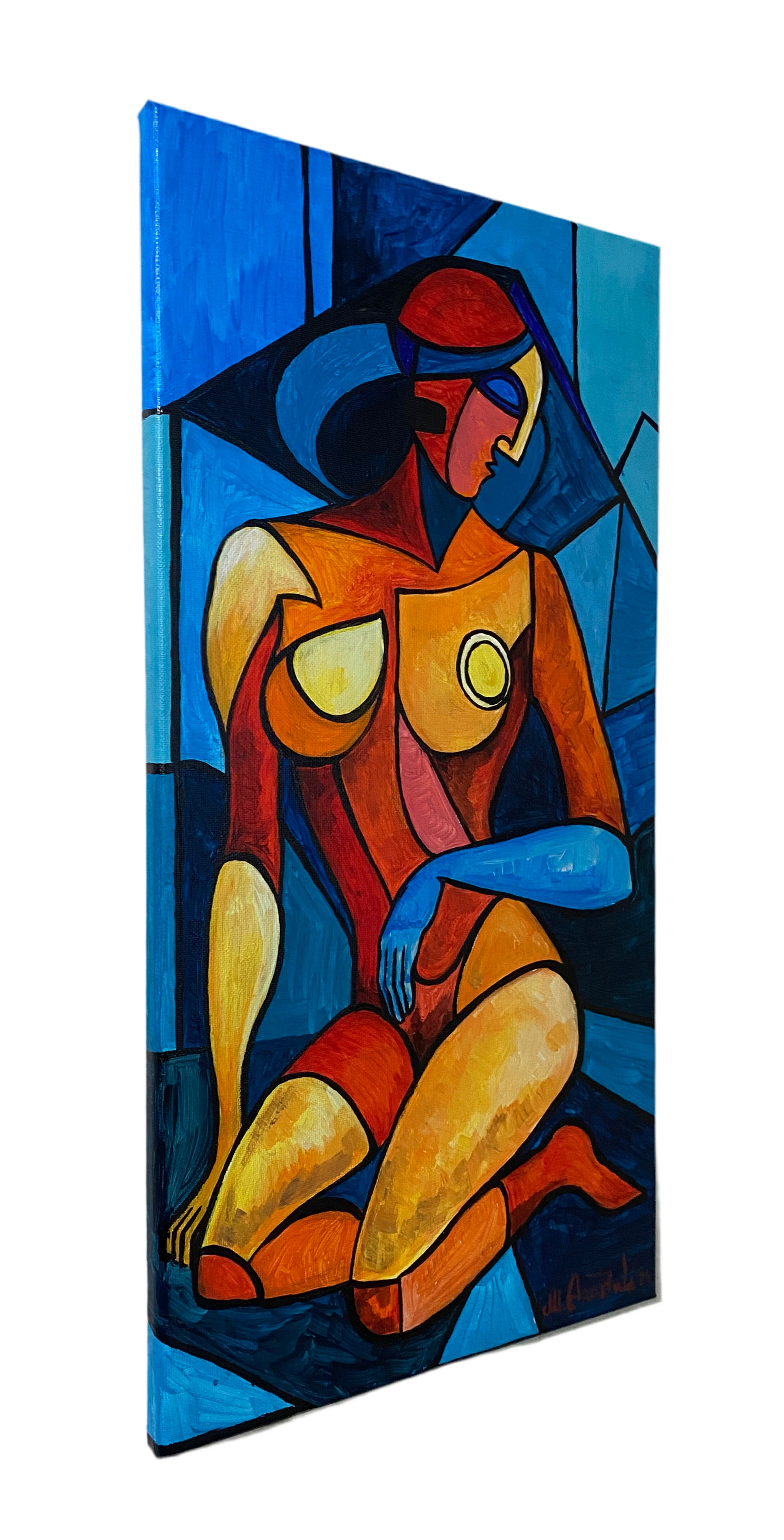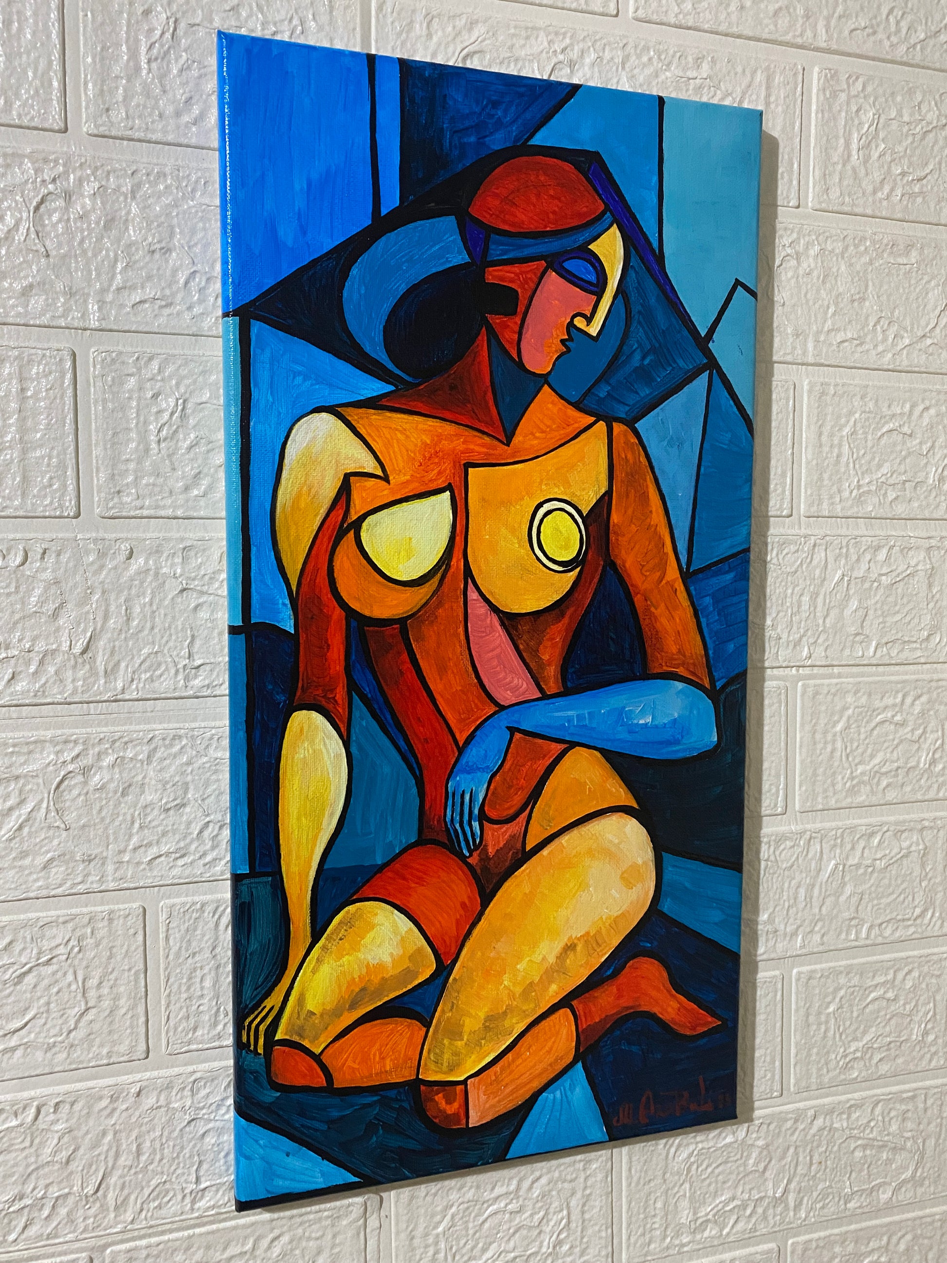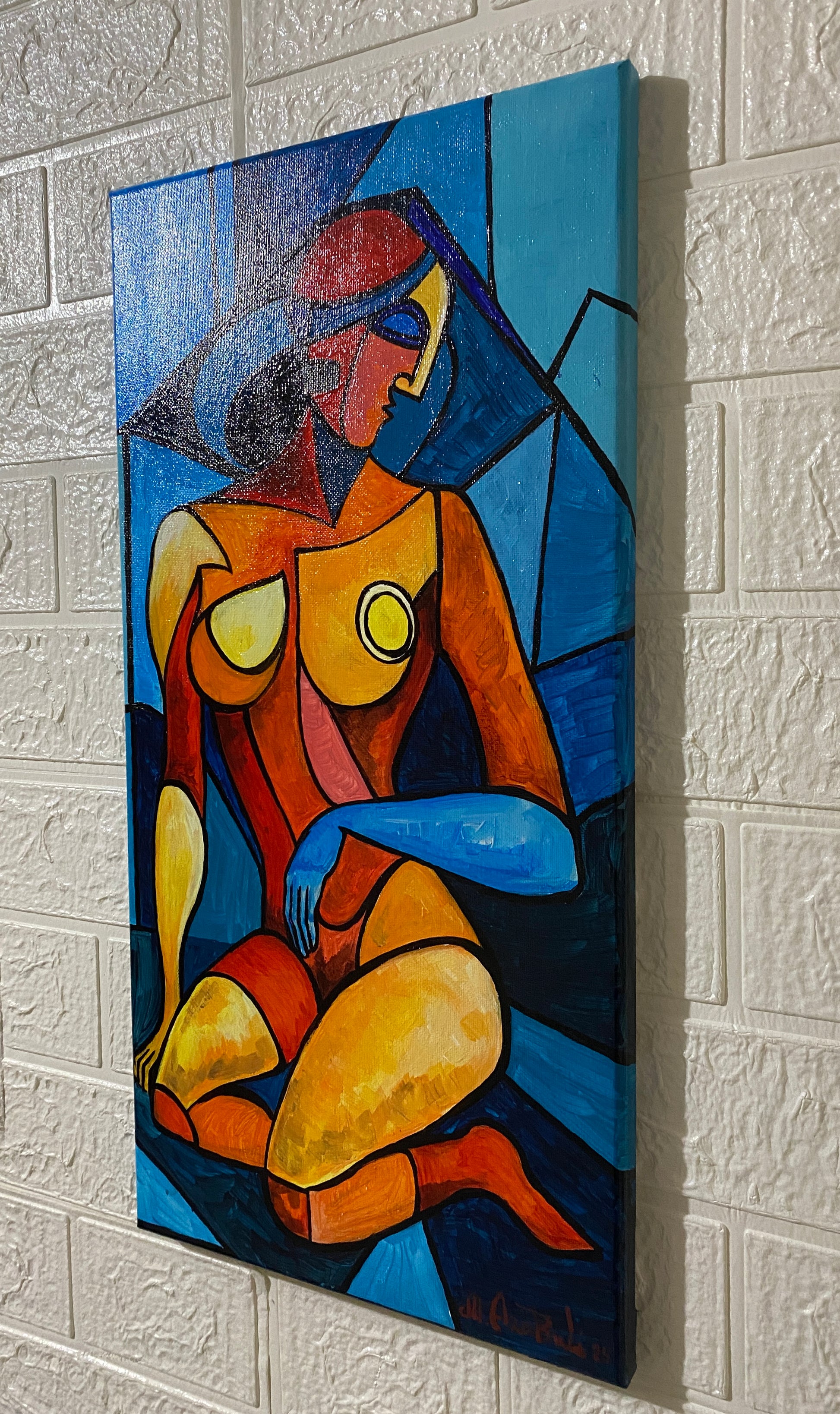 “Bold Reflections” is a striking original acrylic painting on canvas by Maia Arabuli, created in 2025. This 10x20 inch vertical piece captures a powerful female figure rendered in a vibrant cubist style, blending sharp geometric lines with rich, saturated colors. The interplay of warm oranges, deep blues, and glowing yellows evokes a sense of strength, introspection, and emotion.