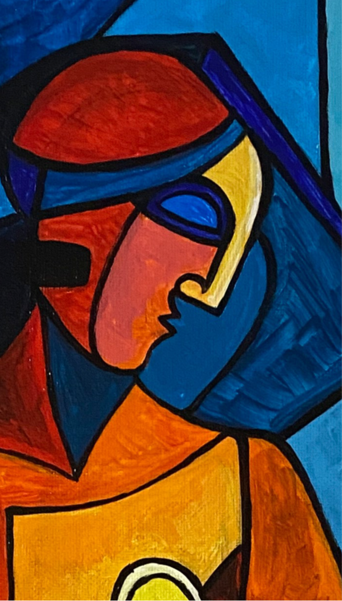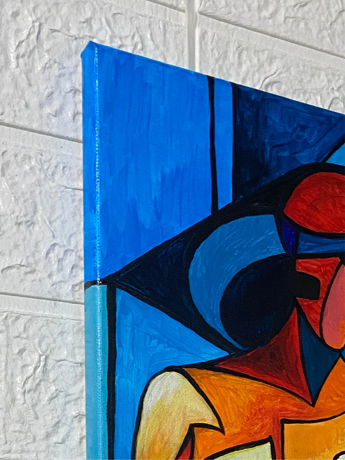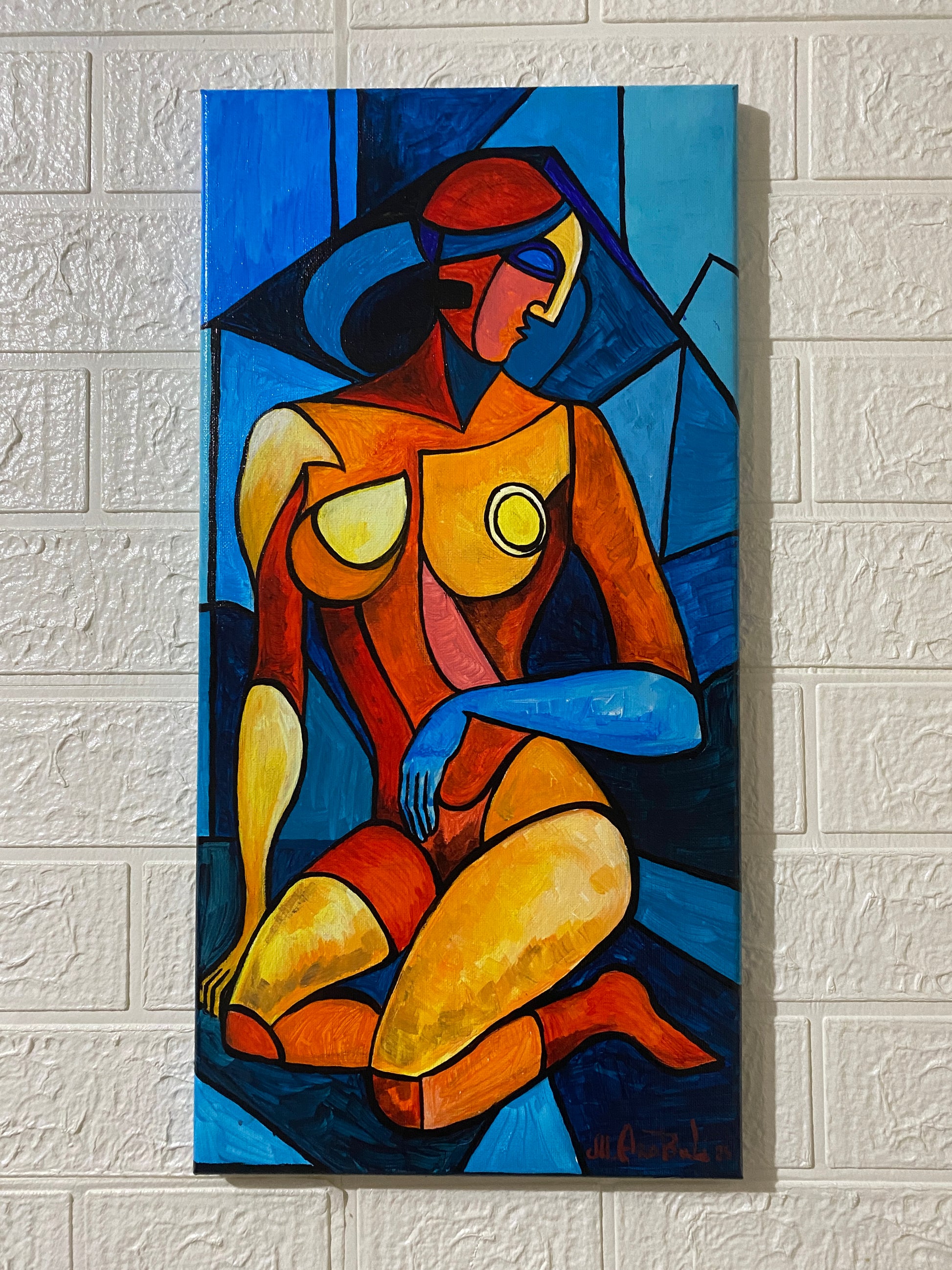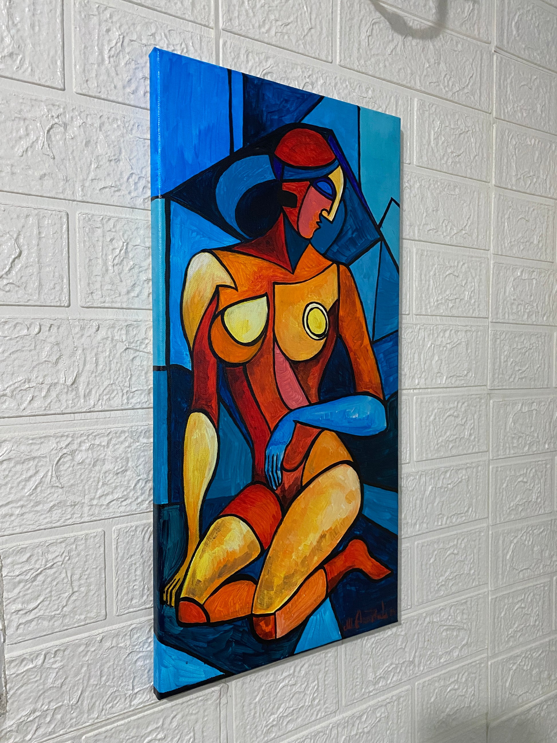 “Bold Reflections” is a striking original acrylic painting on canvas by Maia Arabuli, created in 2025. This 10x20 inch vertical piece captures a powerful female figure rendered in a vibrant cubist style, blending sharp geometric lines with rich, saturated colors. The interplay of warm oranges, deep blues, and glowing yellows evokes a sense of strength, introspection, and emotion.
