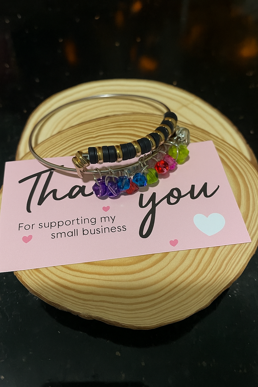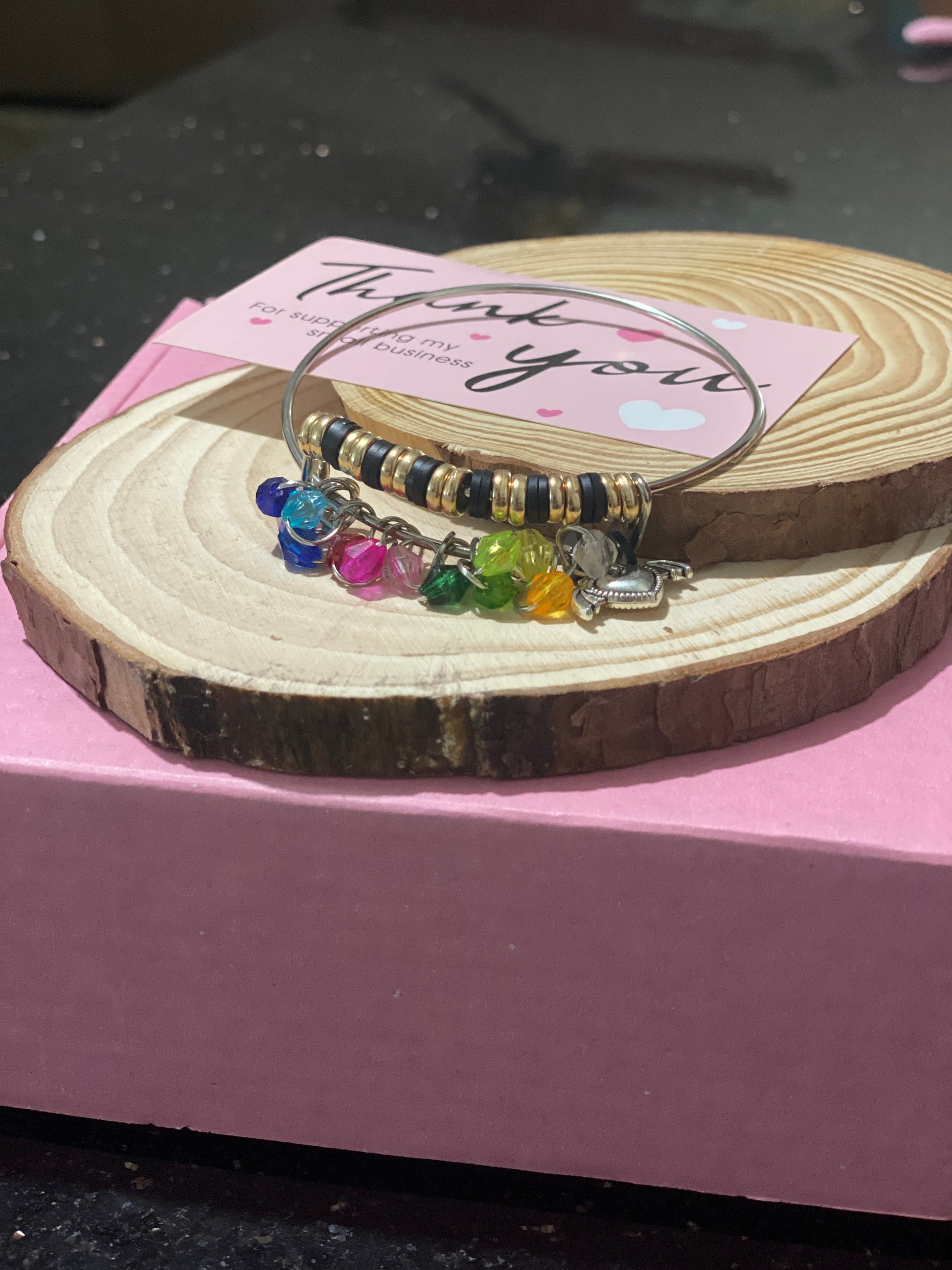 Add a pop of color and joy to your day! This handmade bangle bracelet features vibrant crystal beads, a heart charm with wings, and gold-accented rings. Stylish, lightweight, and perfect for everyday wear or as a meaningful gift.