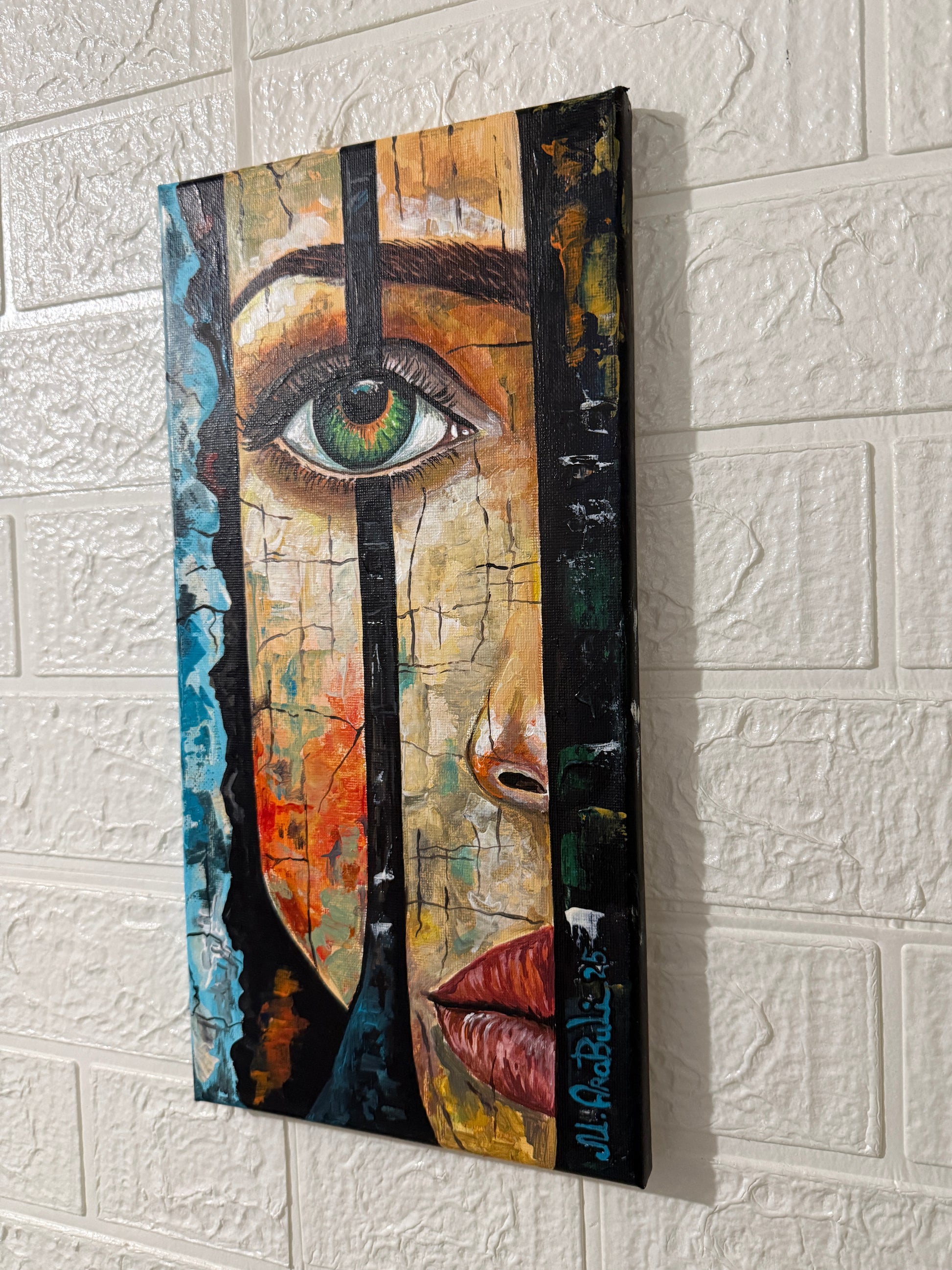 “Whispering Look” captures a hauntingly beautiful moment where a single emerald eye emerges from between abstract, vertical forms reminiscent of tree trunks. The cracked textures and earthy tones suggest the quiet language of the forest—its secrets, memories, and unseen spirits.