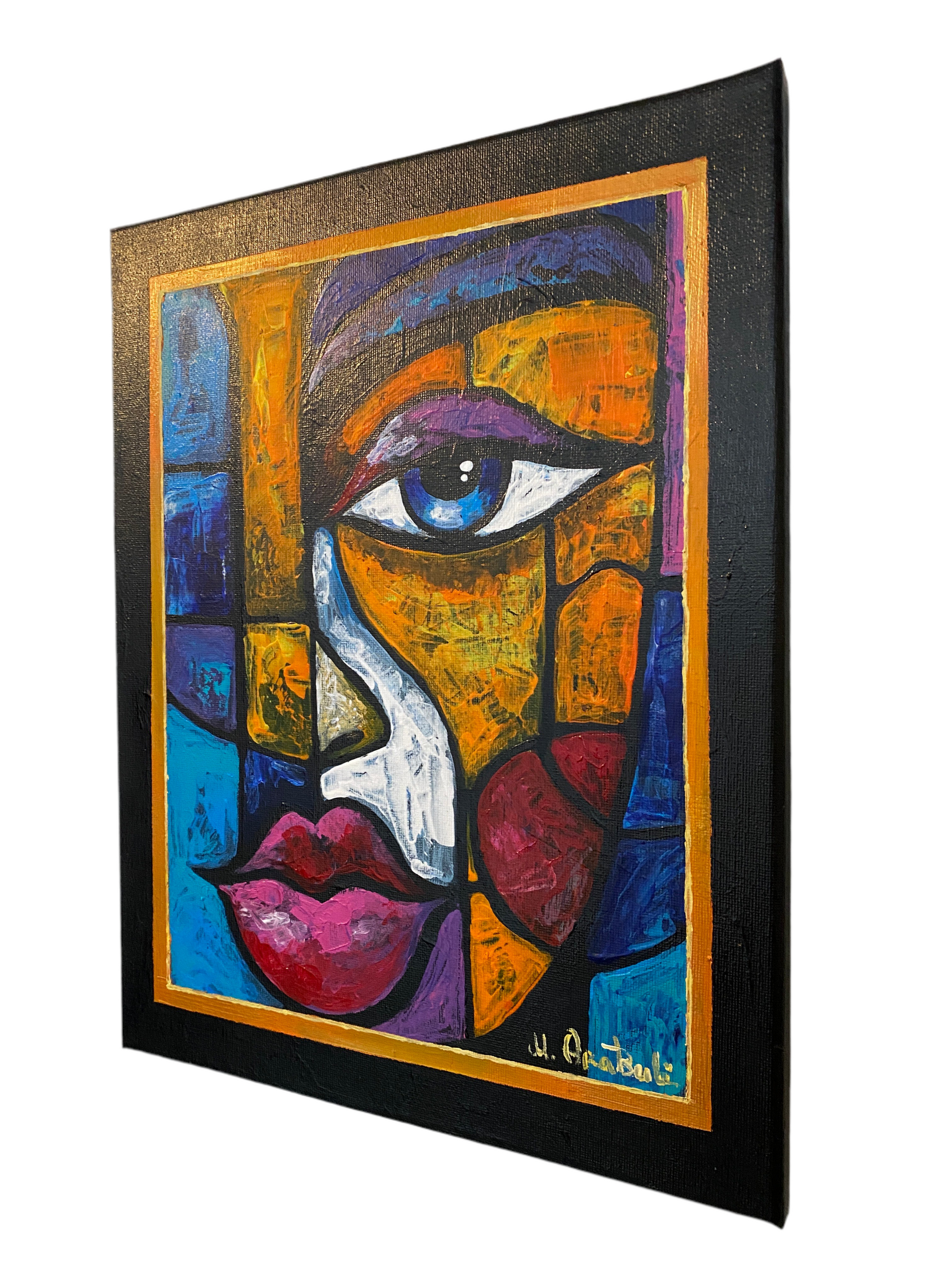 This striking abstract portrait features vivid blues, fiery oranges, deep reds, and rich purples, blending cubism and modern art style.